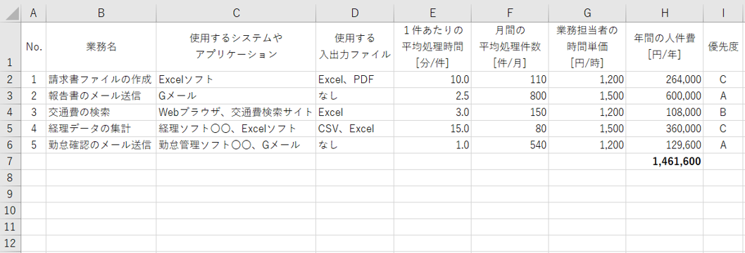 さて、費用対効果の試算と、対象業務の優先順位決めについて説明してきました。これらの内容から、業務整理を行う段階で集めておく要素が見えてきました。業務整理に使用するサンプルシート(簡略版)を示しておきます。
