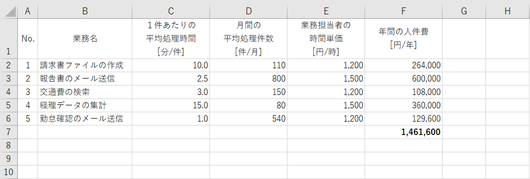 人件費[円/年] = 平均処理時間[分/件] ÷ 60分 × 平均処理件数[件/月] × 業務担当者の時間単価[円/時] × 12ヶ月