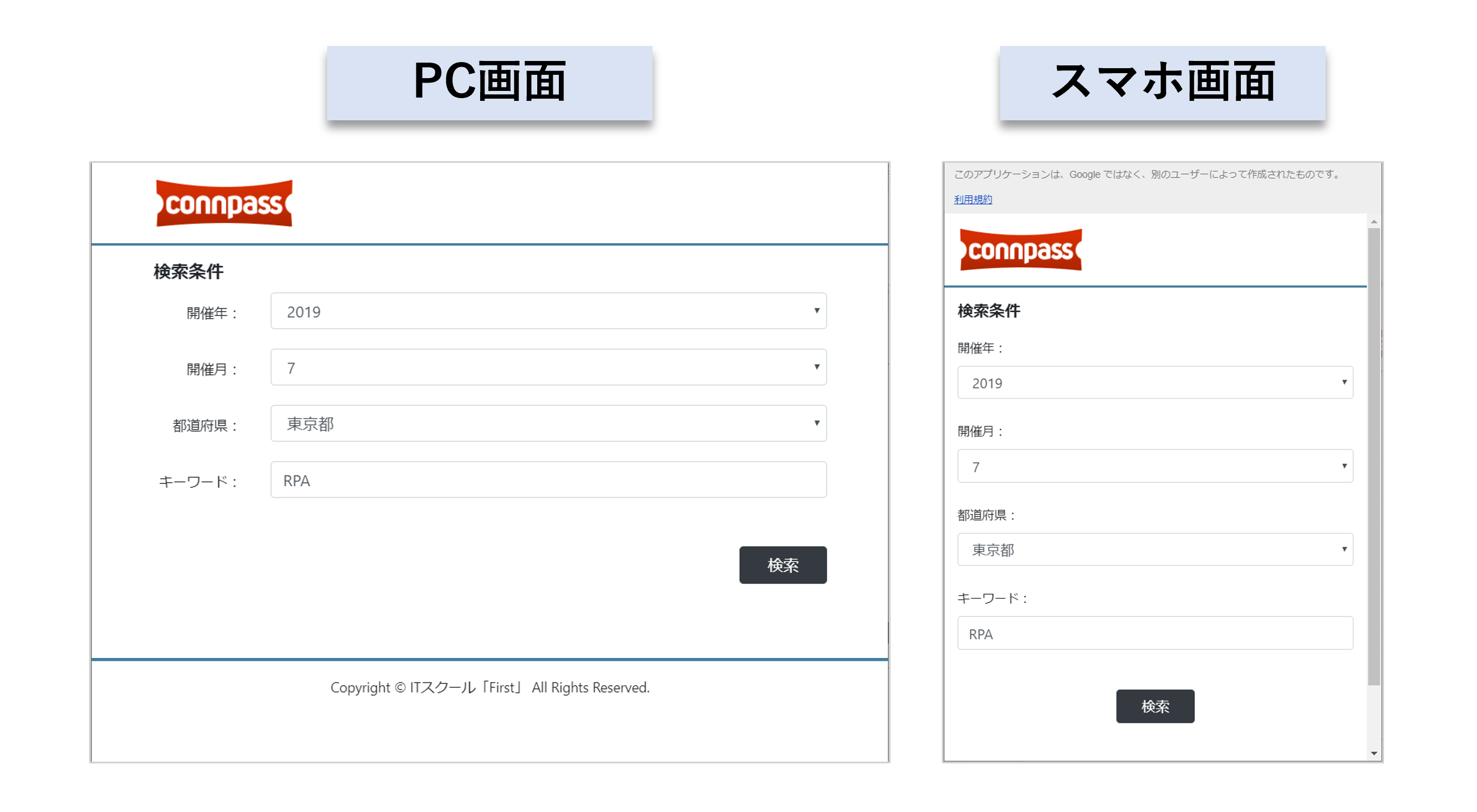 Google Apps Script(GAS)を使って、connpass(IT情報サイト)のイベント情報を検索する、簡易なWebアプリケーションを作ってみました。アプリはこちらからアクセスできます。PCとスマホのどちらでも見れるように、Bootstrapを使ってレスポンシブデザインにしています。