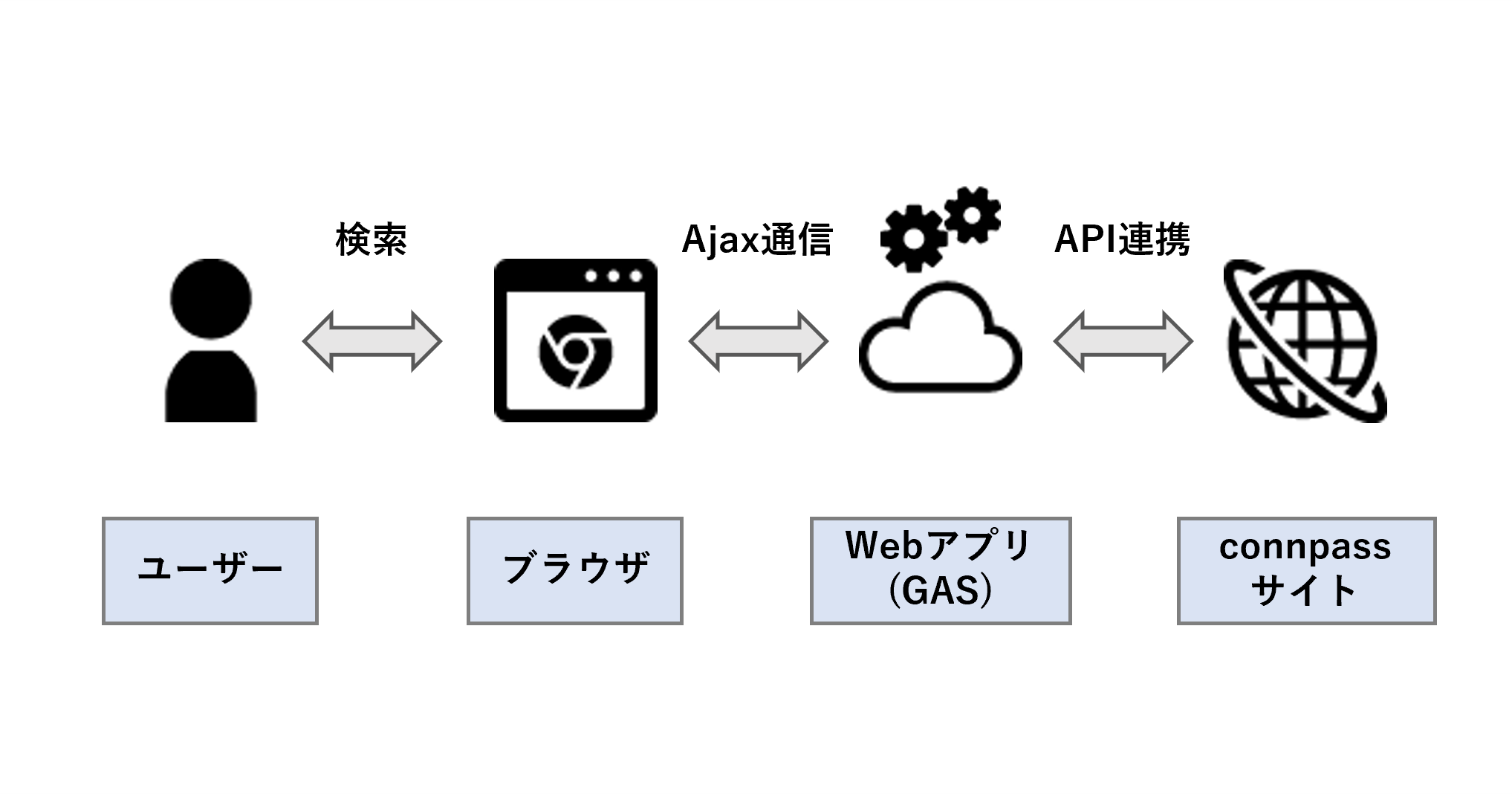 今回開発したWebアプリの概要を下図に示します。Webアプリの主な機能としては、指定した条件に合致するイベント情報をconnpassから取得することです。ブラウザに検索条件を入力して検索ボタンを押します。GASでconnpassのAPIを叩いてイベント情報を取得し、ブラウザに検索結果を表示します。