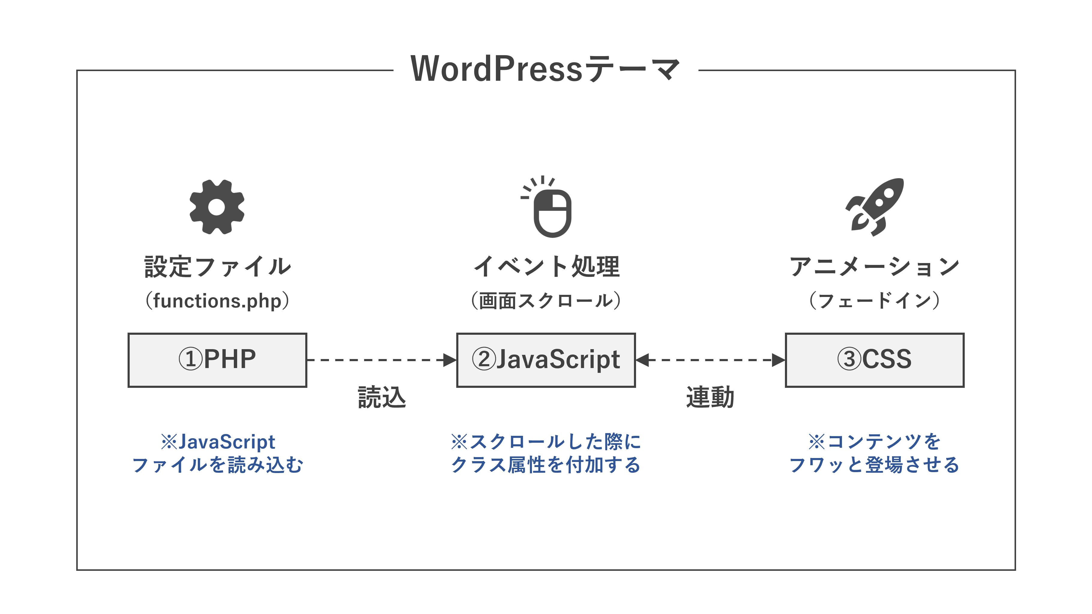 | 設定ファイル(functions.php) | 自作したJavaScriptファイルを読み込ませるために使用するWordPressの設定ファイル。 |