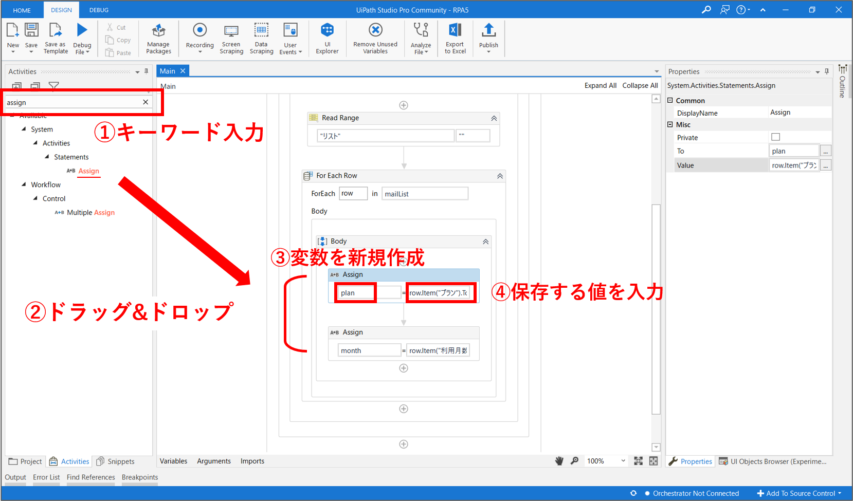 変数への保存は、「assign」アクティビティを使用します。画面左側のアクティビティ検索窓に「assign」と入力します。表示された「assign」を、「For Each Row」のBodyコンテナ内に2つドラッグ&ドロップします。