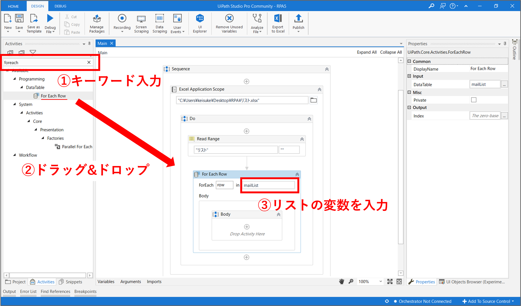 画面左側のアクティビティ検索窓に「foreach」と入力します。表示された「For Each Row」を、「Read Range」の直下にドラッグ&ドロップします。続けて、アクティビティのプロパティ設定を行います。繰り返すデータ(DataTable)には、「mailList」を入力します。変数mailListに保存されたリストから1行ずつデータを取り出し、順に変数rowに代入され、「For Each Row」のBodyコンテナ内で変数rowの値を参照することができます。