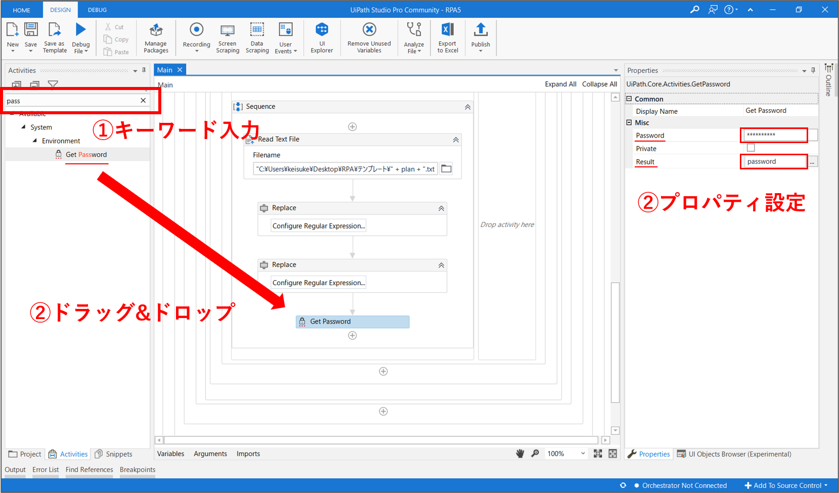 メール送信の設定を行う前に、設定で必要になるパスワード情報を準備します。画面左側のアクティビティ検索窓に「pass」と入力します。表示された「Get Password」アクティビティを「Replace」の下にドラッグ&ドロップしましょう。