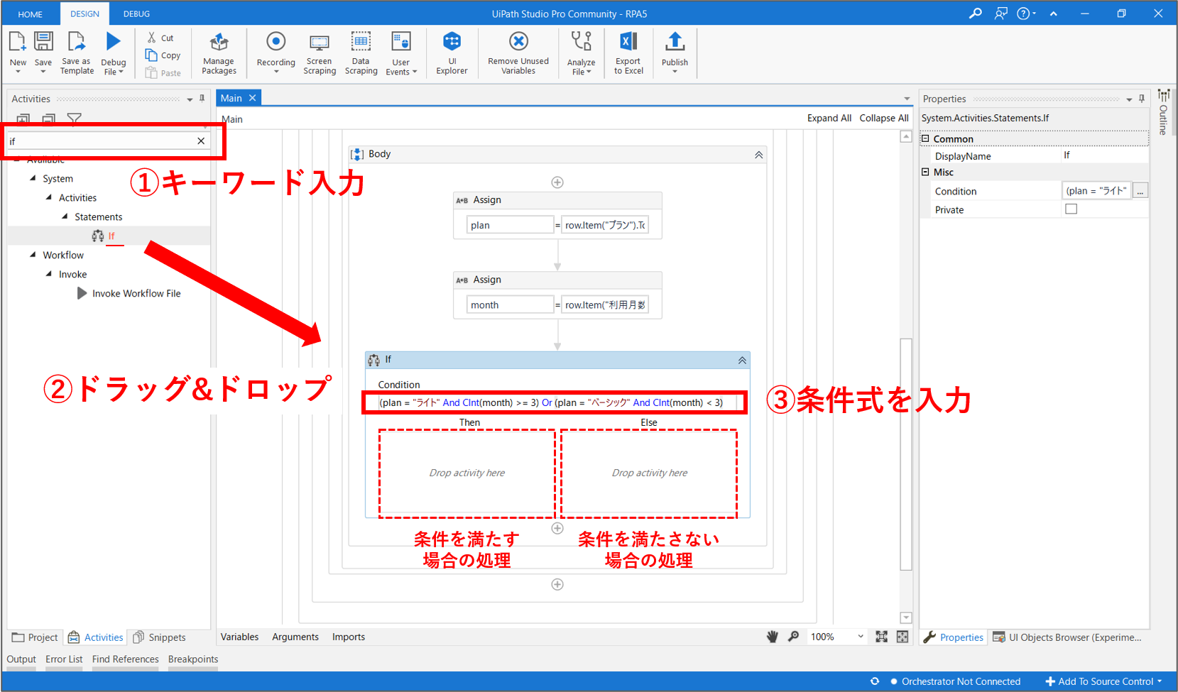 処理を条件分岐させるには、「If」アクティビティを使用します。プランと利用月数に関する条件式を記述する必要があるので、事前にプランと利用月数の値をそれぞれ変数に保存しておきます。
