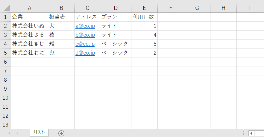 mailList = [ ["株式会社いぬ", "犬", "a@co.jp", "ライト", "1"], ["株式会社さる", "猿", "b@co.jp", "ライト", "4"], ["株式会社きじ", "雉", "c@co.jp", "ベーシック", "5"], ["株式会社おに", "鬼", "d@co.jp", "ベーシック", "2"] ]