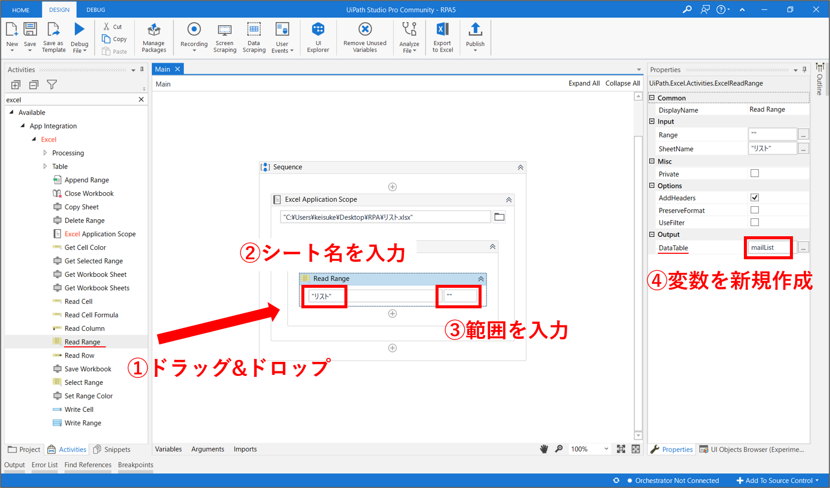 Excelリストのデータを読み込むために、「Read Range」アクティビティをDoコンテナ内にドラッグ&ドロップします。