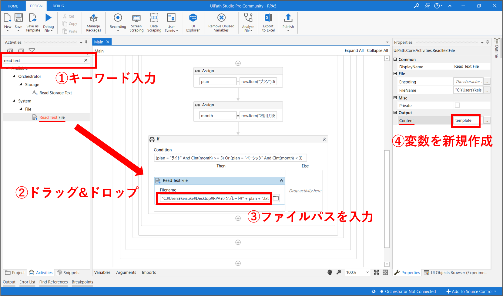 プランの種類(ライト、ベーシック)に応じたテンプレートファイルを読み込みます。画面左側のアクティビティ検索窓に「read text」と入力します。表示された「Read Text File」アクティビティを、「if」アクティビティのThenコンテナ内にドラッグ&ドロップします。