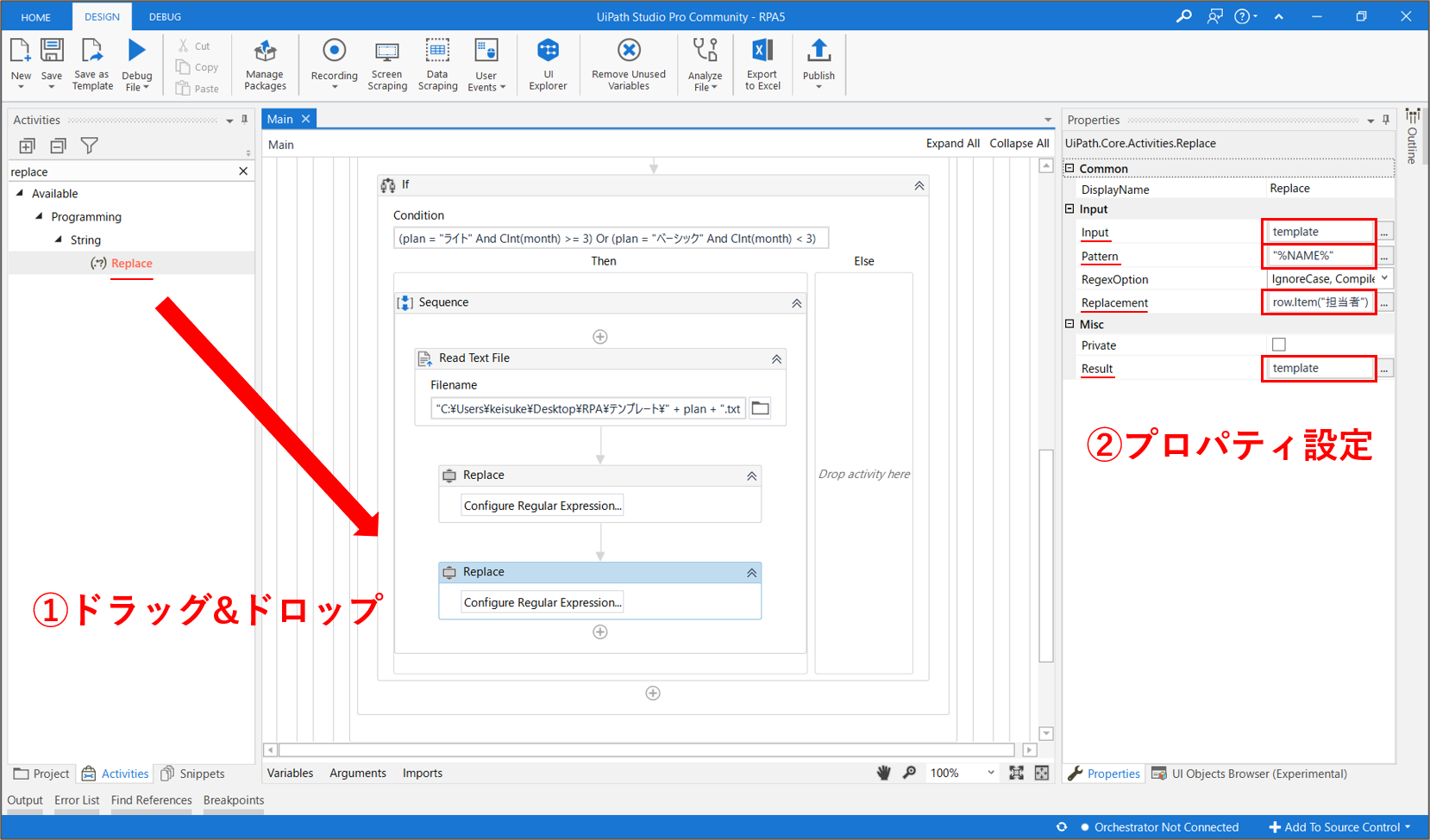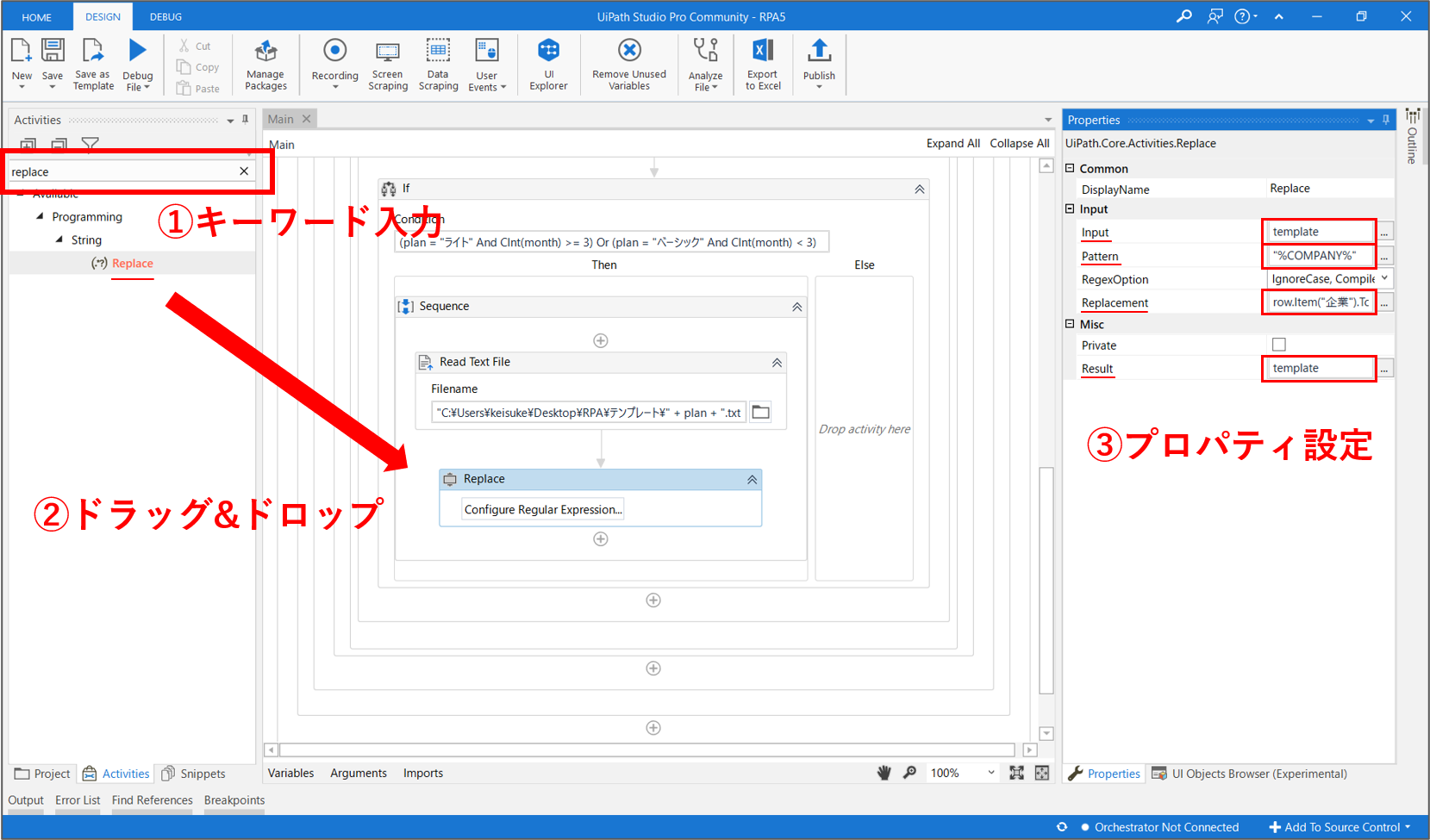 先ずは、「%COMPANY%」を具体的な値に書き換えます。画面左側のアクティビティ検索窓に「replace」と入力します。表示された「Replace」アクティビティを「Read Text File」の下にドラッグ&ドロップしましょう。