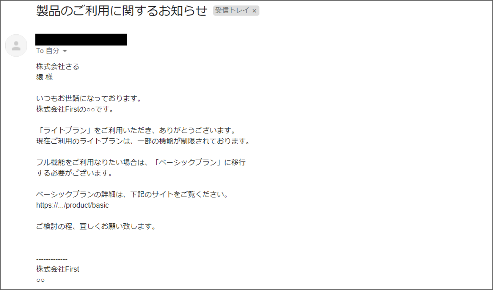 %COMPANY% %NAME% 様 いつもお世話になっております。 株式会社Firstの○○です。 「ライトプラン」をご利用いただき、ありがとうございます。 現在ご利用のライトプランは、一部の機能が制限されております。 フル機能をご利用なりたい場合は、「ベーシックプラン」に移行 する必要がございます。 ベーシックプランの詳細は、下記のサイトをご覧ください。 https://.../product/basic ご検討の程、宜しくお願い致します。 ------------- 株式会社First ○○