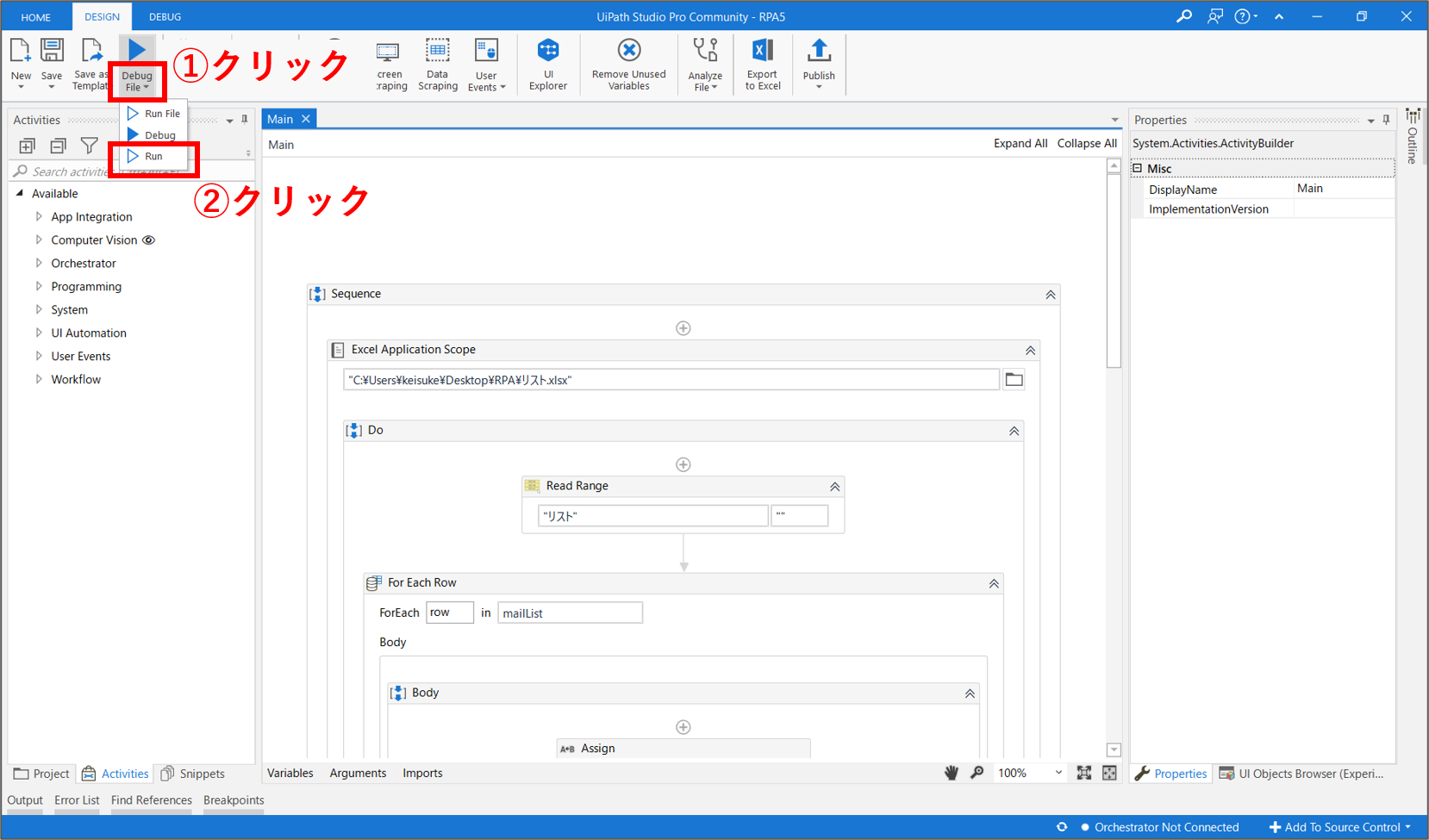 - 「Excel Application Scope」を使ってExcelファイルを開く