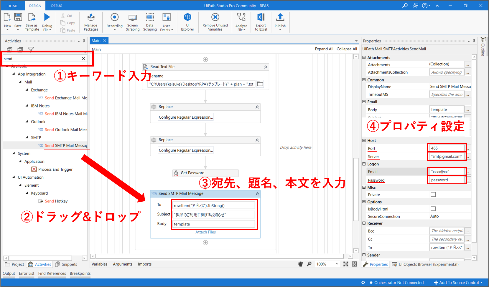 最後に、メールを送信するアクティビティを追加します。画面左側のアクティビティ検索窓に「send」と入力します。表示された「Send SMTP Mail Message」アクティビティを「Get Password」の下にドラッグ&ドロップしましょう。