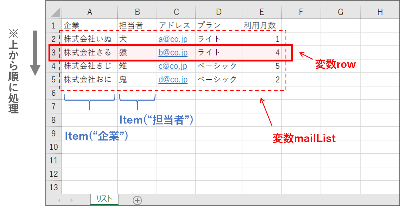 下図を見てください。今回のケースでは、リストに4行のデータがあるため、「For Each Row」のBodyコンテナ内の処理が4回繰り返されます。処理を実行する度に、変数rowには、[“企業”, “担当者”, “アドレス”, “プラン”, “利用月数”]の一次元配列が順に代入されます。
