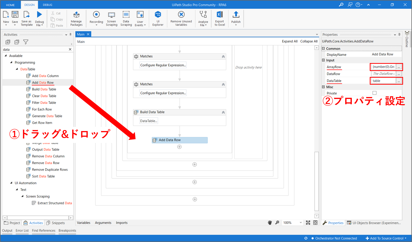 Step.12で作成した空のテーブルに、行データを追加します。行データの追加は、「Add Data Row」アクティビティを使用します。「Add Data Row」を、「Build Data Table」の下にドラッグ&ドロップします。