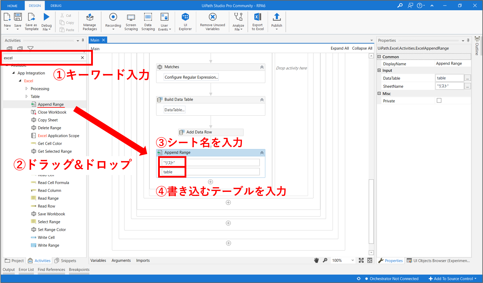 ワークフローの最後に、出力ファイル(リスト.xlsx)にテーブルを書き込む処理を追加します。なお、今回は、書き込む位置を指定せずに、ファイルの一番下にテーブルを書き込むようにします。画面左側のアクティビティ検索窓に「excel」と入力します。表示された「Append Range」アクティビティを、「Add Data Row」の直下にドラッグ&ドロップします。