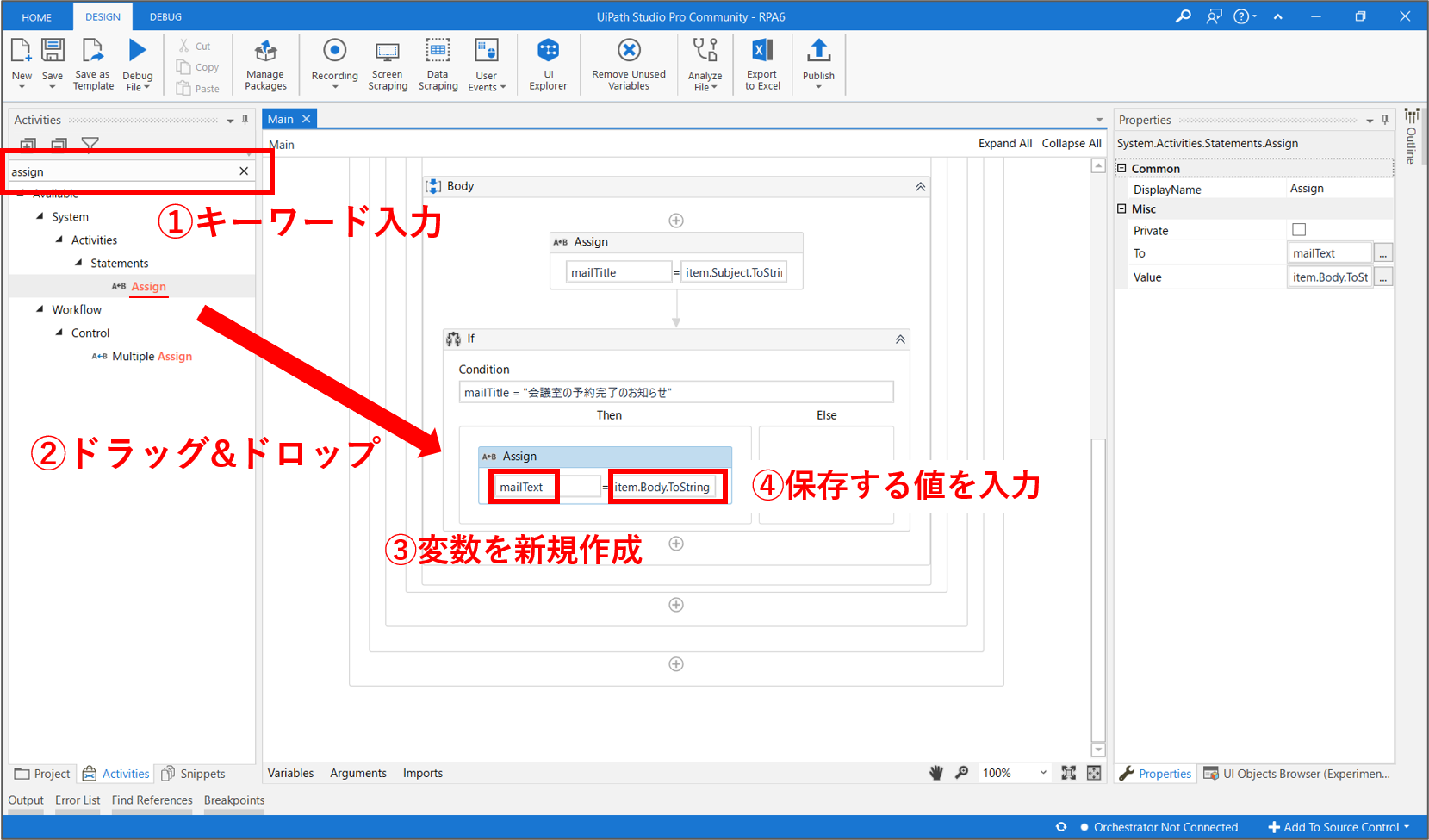 各メールの本文を取得するには、「item.Body.ToString()」と記述します。メールの題名と同様に、変数に保存しておきましょう。画面左側のアクティビティ検索窓に「assign」と入力します。表示された「Assign」を、「if」アクティビティのThenコンテナ内にドラッグ&ドロップします。