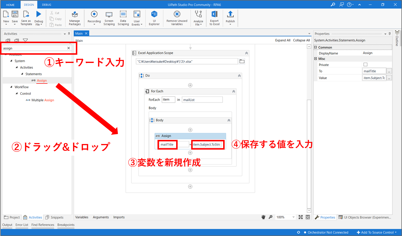 変数を新規作成して、何かしらの値を保存するには、「Assign」アクティビティを使用します。画面左側のアクティビティ検索窓に「assign」と入力します。表示された「Assign」を、「For Each」のBodyコンテナ内にドラッグ&ドロップします。