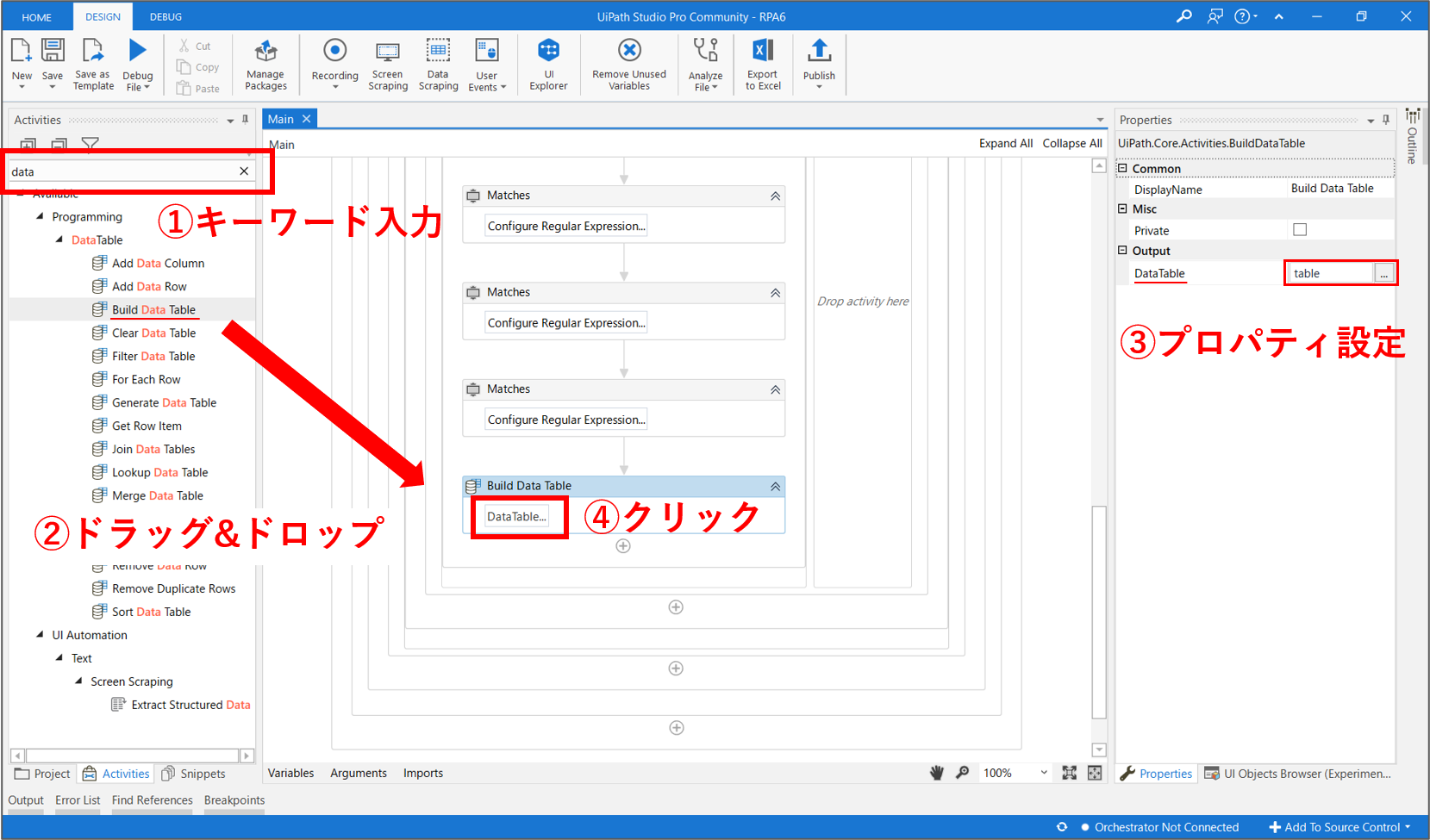 出力用のテーブルを作成するには、「Build Data Table」アクティビティを使用します。面左側のアクティビティ検索窓に「data」と入力します。表示された「Build Data Table」を、「Matches」の下にドラッグ&ドロップします。