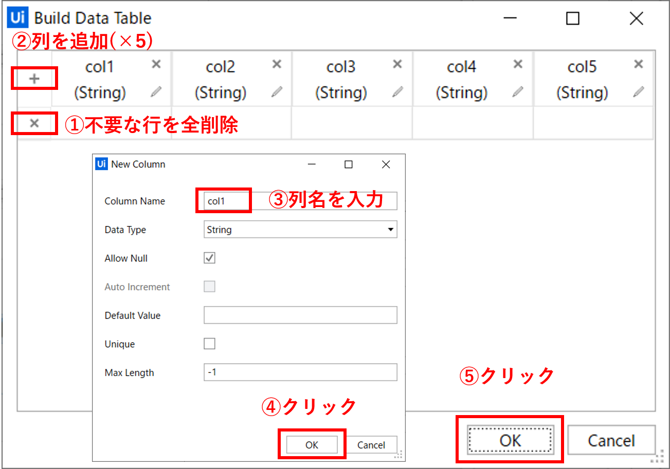 出力するデータは5つなので、テーブルに列を5つ用意します。今回は値だけを出力するので、列名は適当で構いません。テーブルの中身は後で追加するため、今は空のままで問題ありません。ここでは、列情報のみ設定した空のテーブルを作っておきます。