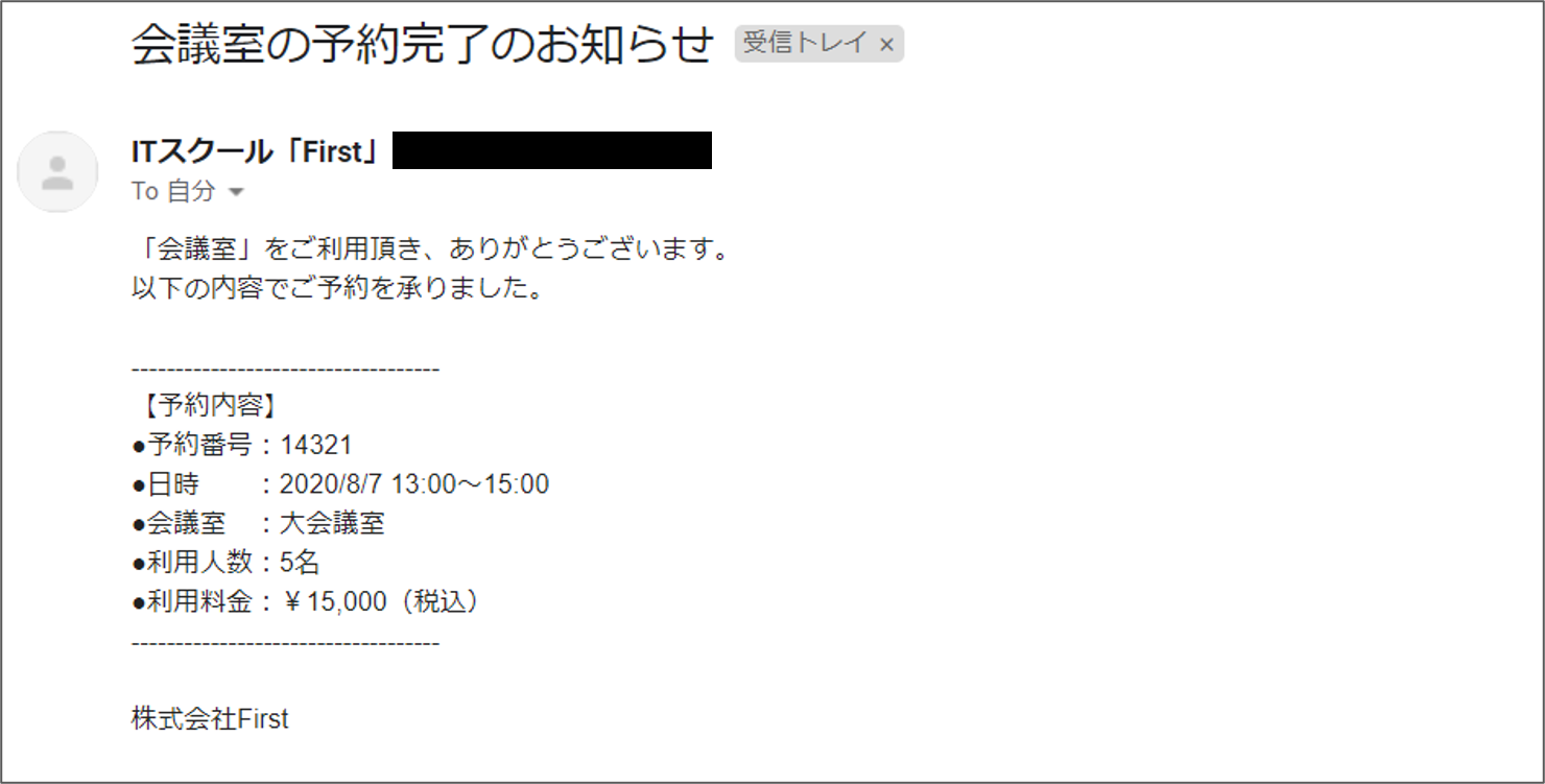 「会議室」をご利用頂き、ありがとうございます。 以下の内容でご予約を承りました。 ------------------------- 【予約内容】 ●予約番号:14321 ●日時 :2020/8/7 13:00~15:00 ●会議室 :大会議室 ●利用人数:5名 ●利用料金:¥15,000(税込) ------------------------- 株式会社First