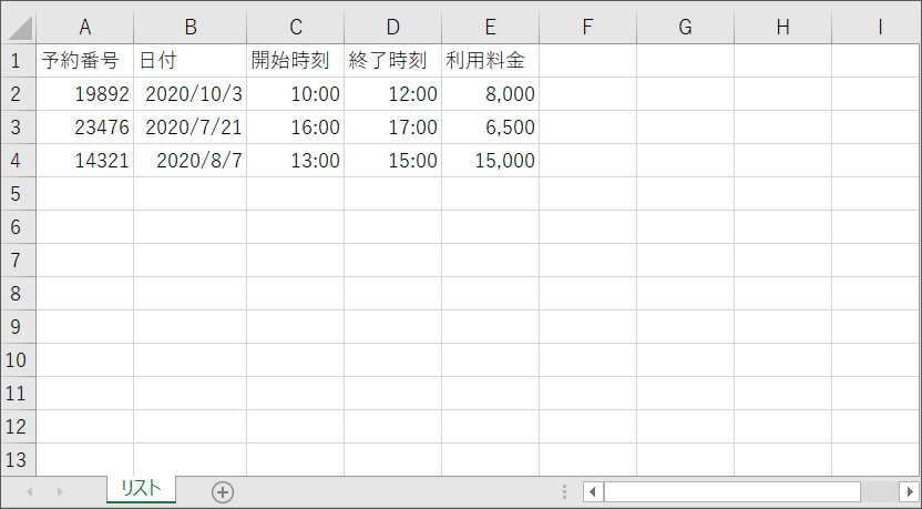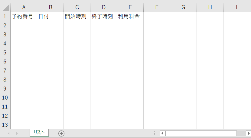 メールから抽出したデータを保存するために、下記のようなExcelファイルを作成しておきます。ファイル名は「リスト.xlsx」、シート名は「リスト」としました。
