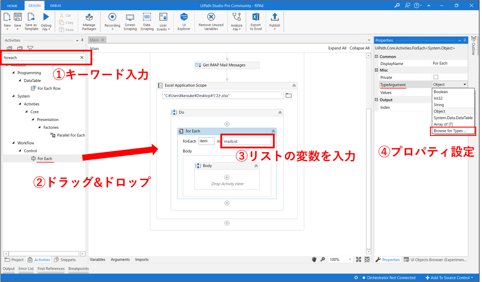 受信メールを1件ずつ取り出して、順にデータを抽出していきたいです。変数mailListに保存されたメールを1件ずつ取り出すために、「For Each」アクティビティを使用します(※「For Each Row」と間違わないように)。