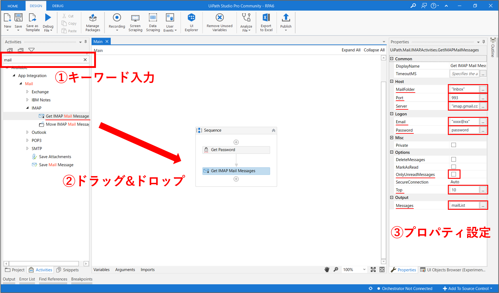 受信トレイにあるメール(複数)を取得します。メールを取得するアクティビティには幾つか種類がありますが、今回は「Get IMAP Mail Messages」を使用します。画面左側のアクティビティ検索窓に「mail」と入力します。表示された「Get IMAP Mail Messages」を、「Get Password」の下にドラッグ&ドロップしましょう。