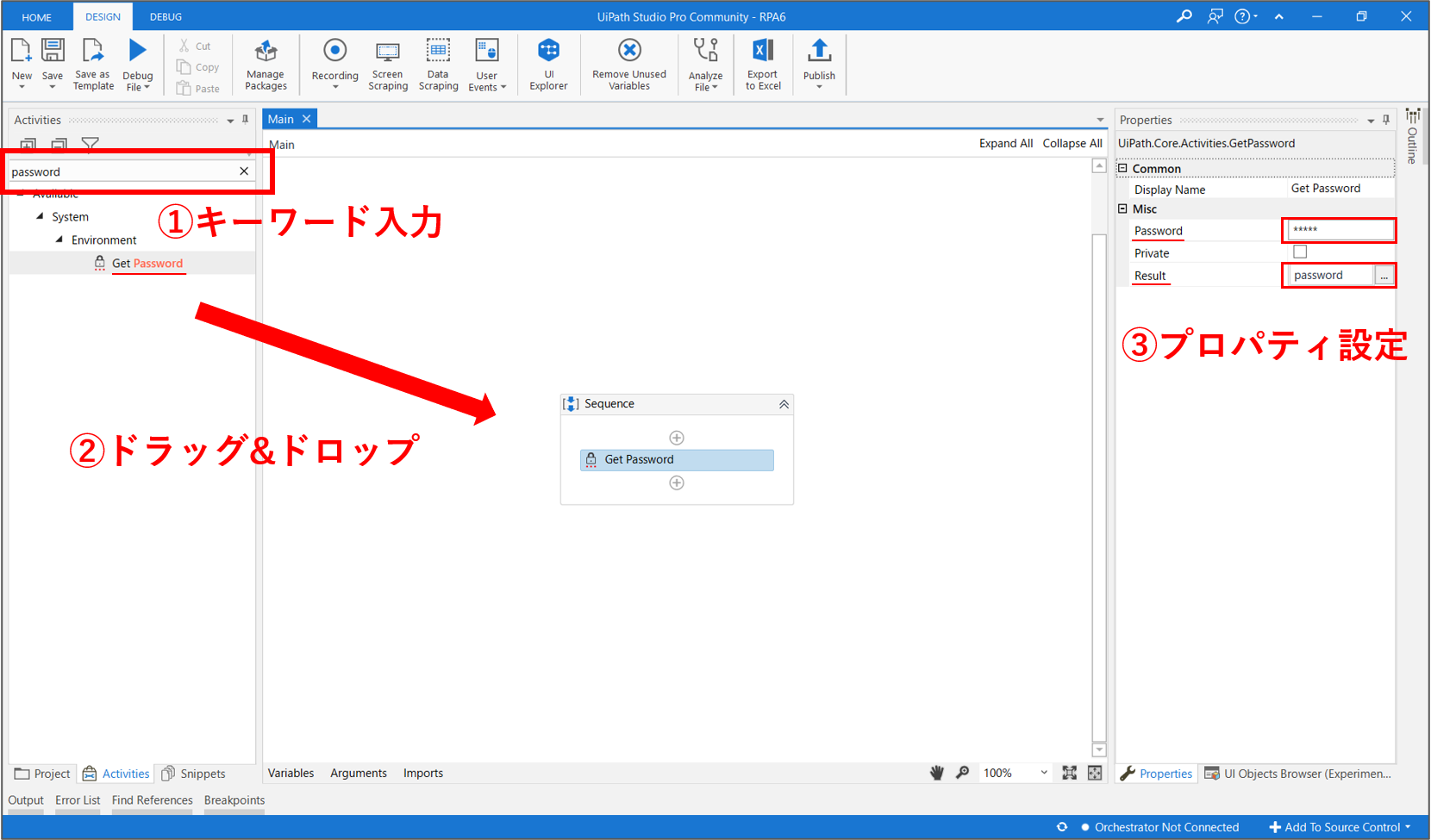 メール取得の設定を行う前に、設定で必要になるパスワード情報を準備します。画面左側のアクティビティ検索窓に「password」と入力します。表示された「Get Password」アクティビティをワークフロー内にドラッグ&ドロップします。