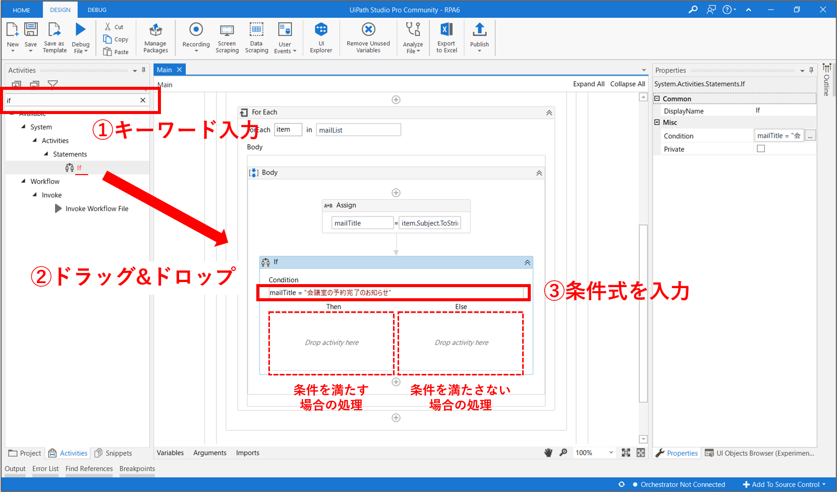 今回は、メールの題名が「会議室の予約完了のお知らせ」に完全一致したメールのみ処理します。ダミーメールは処理しません。処理を条件分岐させるには、「If」アクティビティを使用します。画面左側のアクティビティ検索窓に「if」と入力します。表示された「If」を、「assign」の直下にドラッグ&ドロップします。