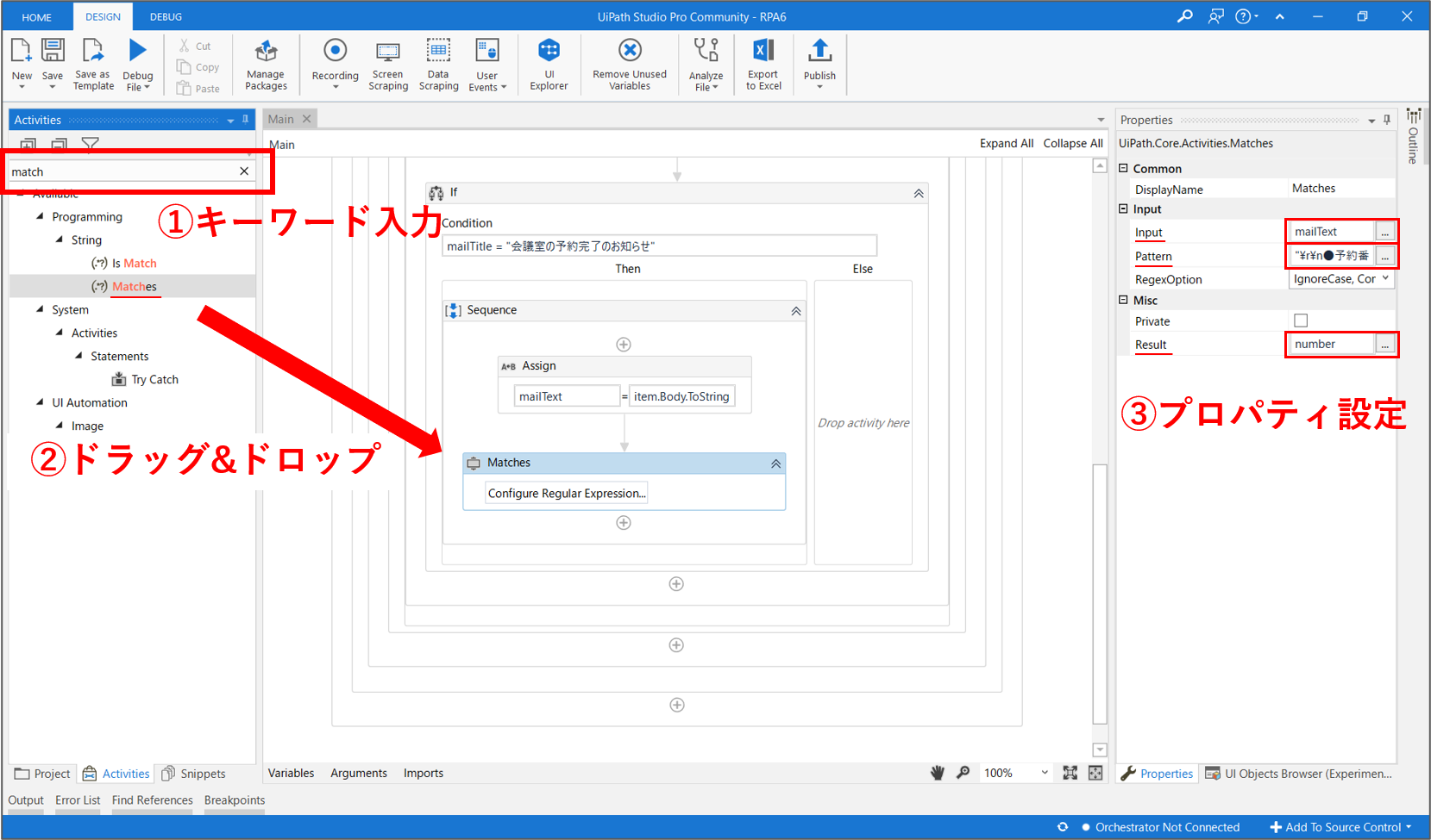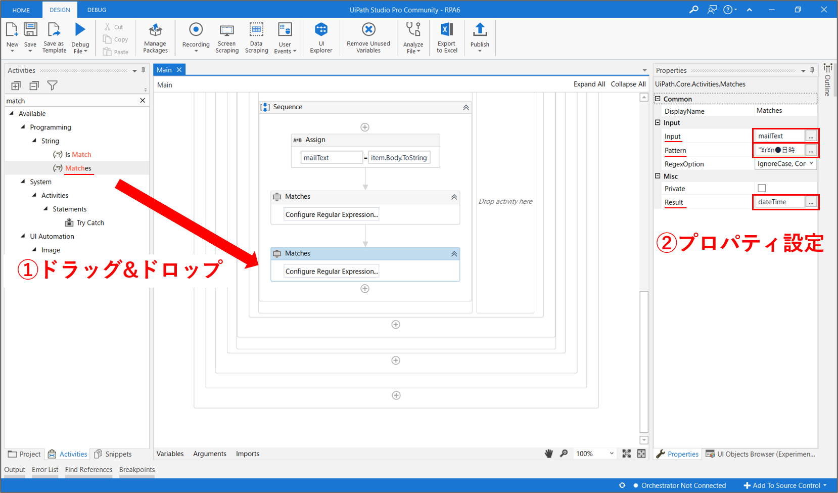 メールの本文から「日付」「開始時刻」「終了時刻」を抽出します。「Matches」アクティビティを「Assign」の下にドラッグ&ドロップしましょう。