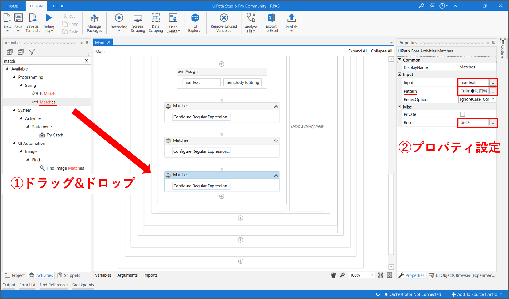 メールの本文から「利用料金」を抽出します。「Matches」アクティビティを「Assign」の下にドラッグ&ドロップしましょう。