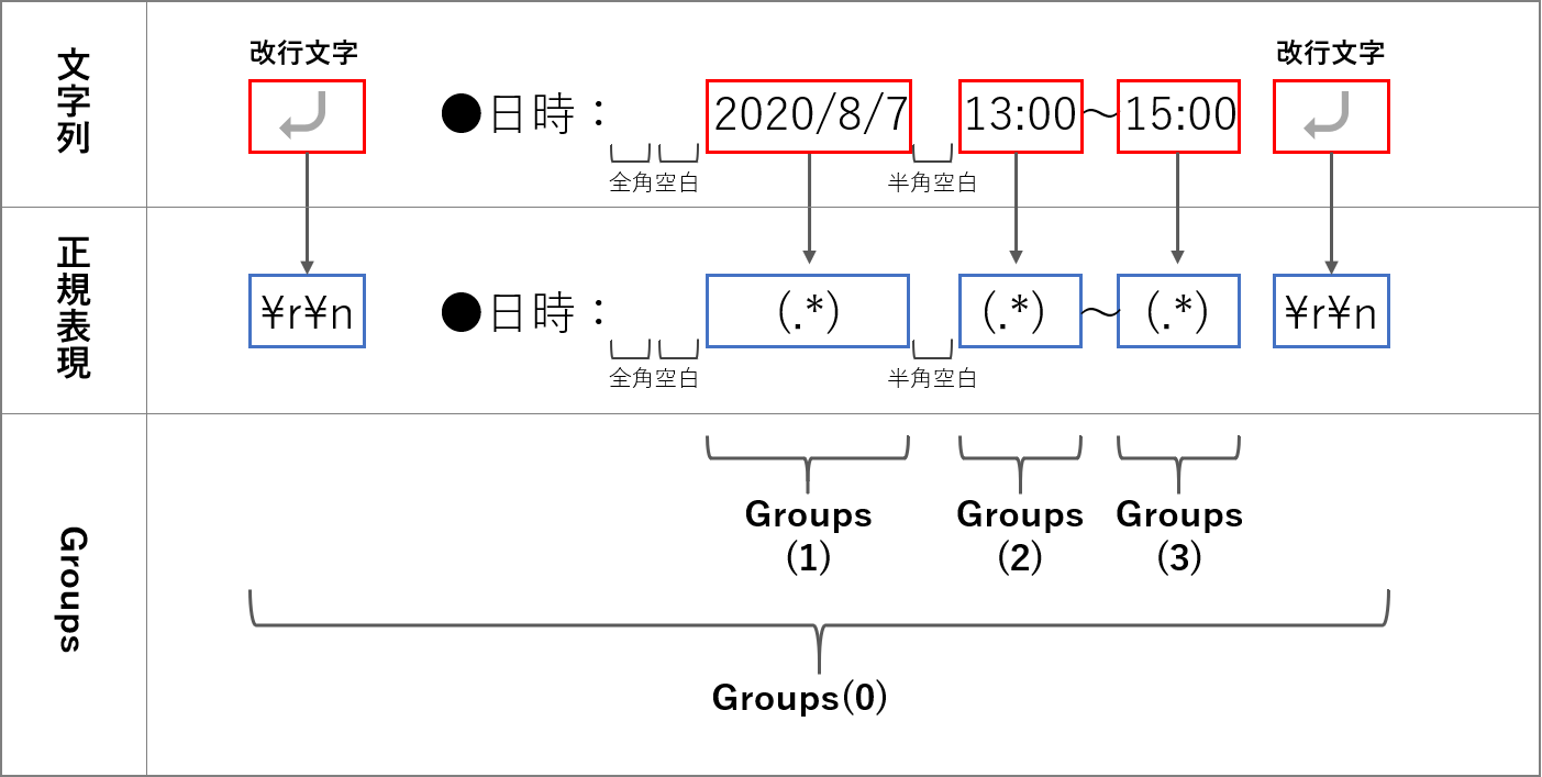 メール本文の日時に関する情報は、「\r\n●日時 :(.*) (.*)~(.*)\r\n」というパターンで取得できます(※空白を含む)。下図を見てください。
