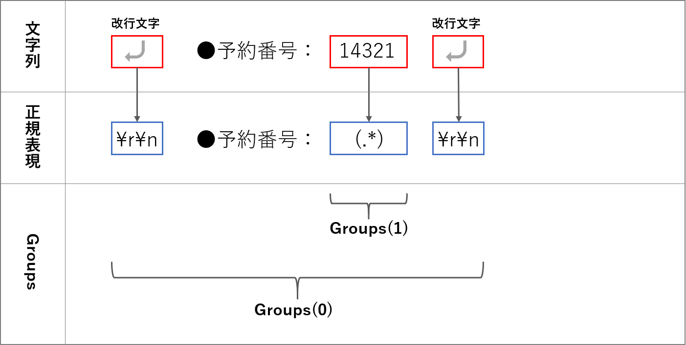 正規表現のマッチングの精度を上げるために、検索対象(●予約番号:xxxxx)の前後に改行文字が存在すると考えて取り扱います。正規表現ではWindows環境の改行文字は「\r\n」と表記します。