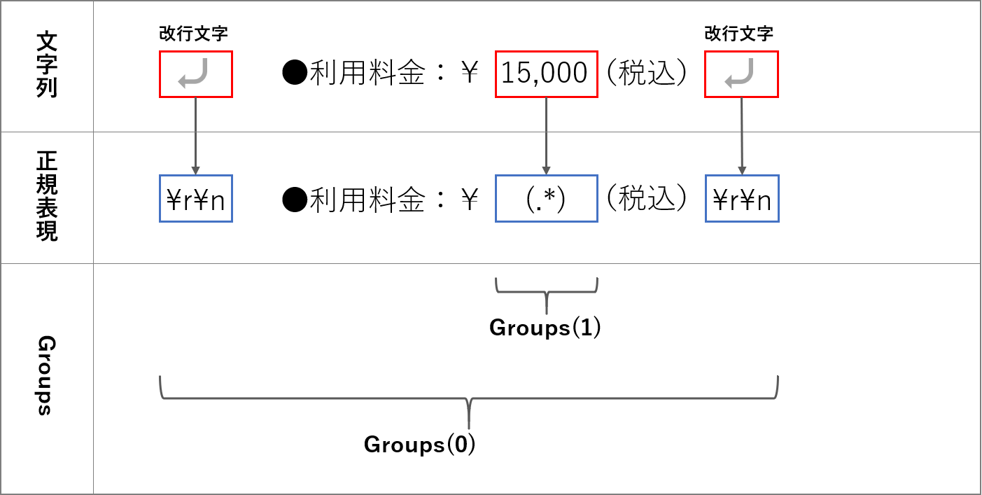 正規表現のマッチングの精度を上げるために、検索対象(●利用料金:¥x,xxx(税込))の前後に改行文字が存在すると考えて取り扱います。正規表現ではWindows環境の改行文字は「\r\n」と表記します。