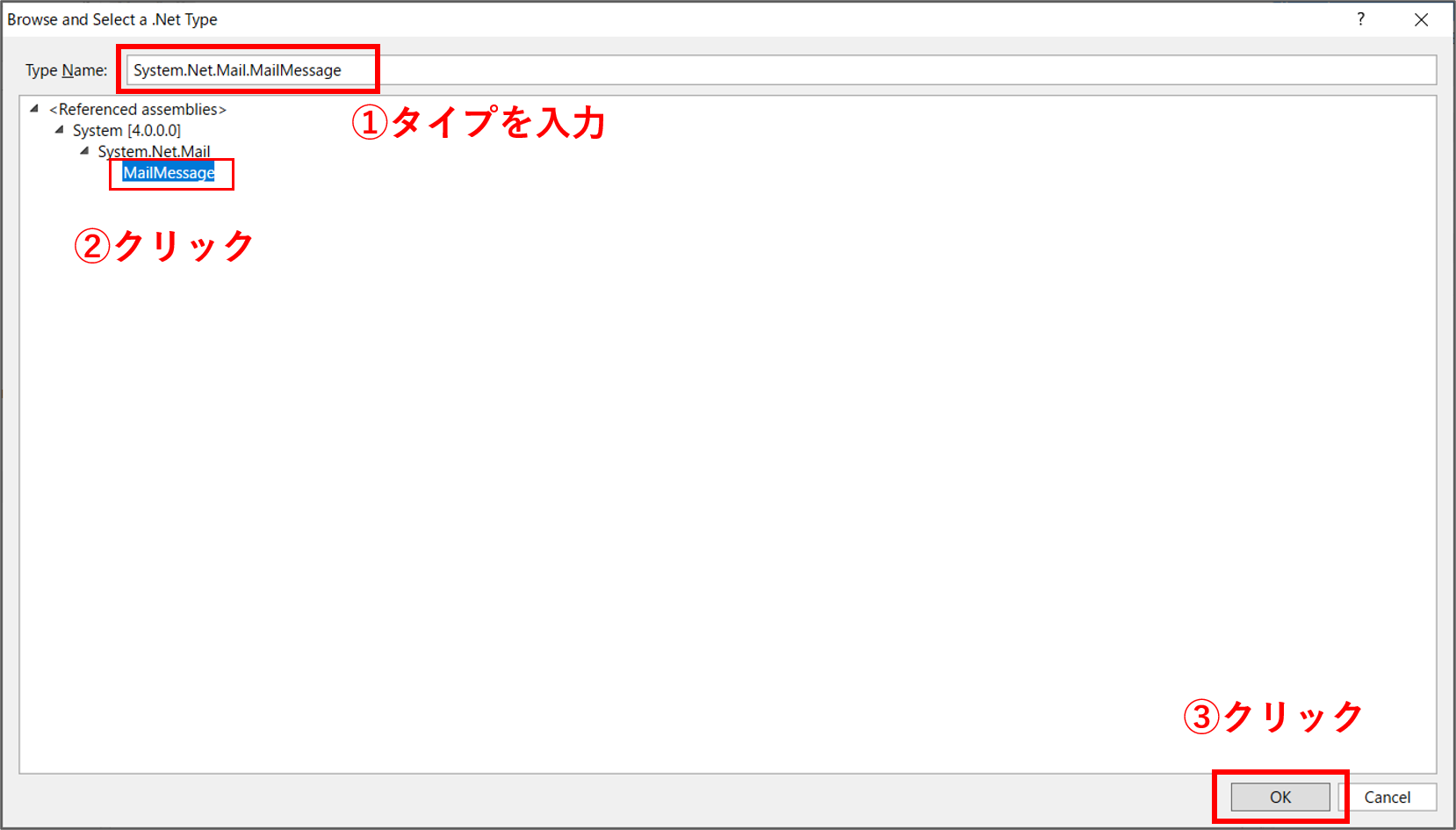 「Type Name:」の入力欄に、「System.Net.Mail.MailMessage」と入力すると、「MailMessage」タイプが表示されます。これを選択して、「OK」ボタンをクリックしましょう。これで、繰り返すデータ(Values)のタイプを「MailMessage」に設定することができました。