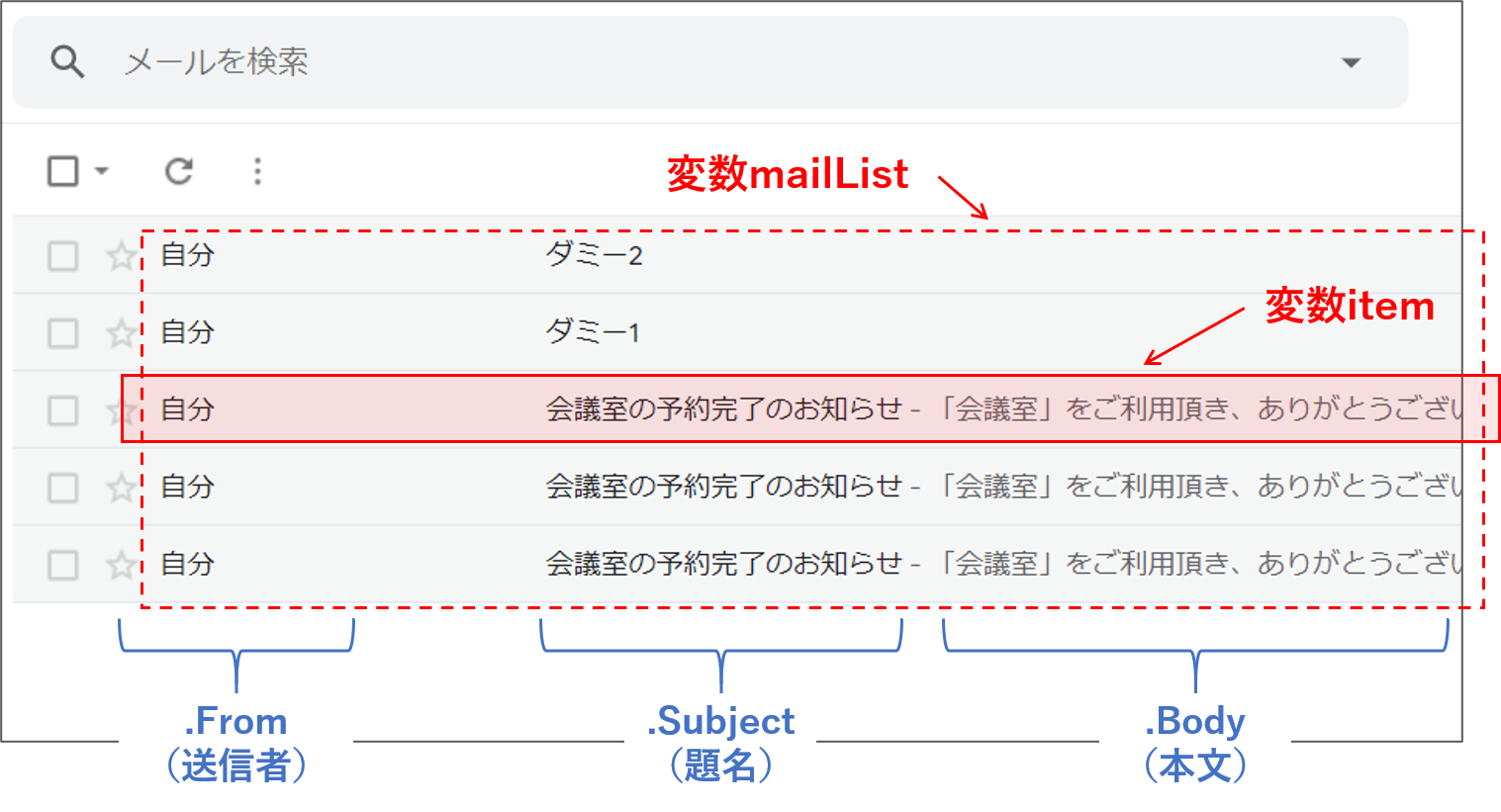 送信者 → item.From.ToString() 題名 → item.Subject.ToString() 本文 → item.Body.ToString()