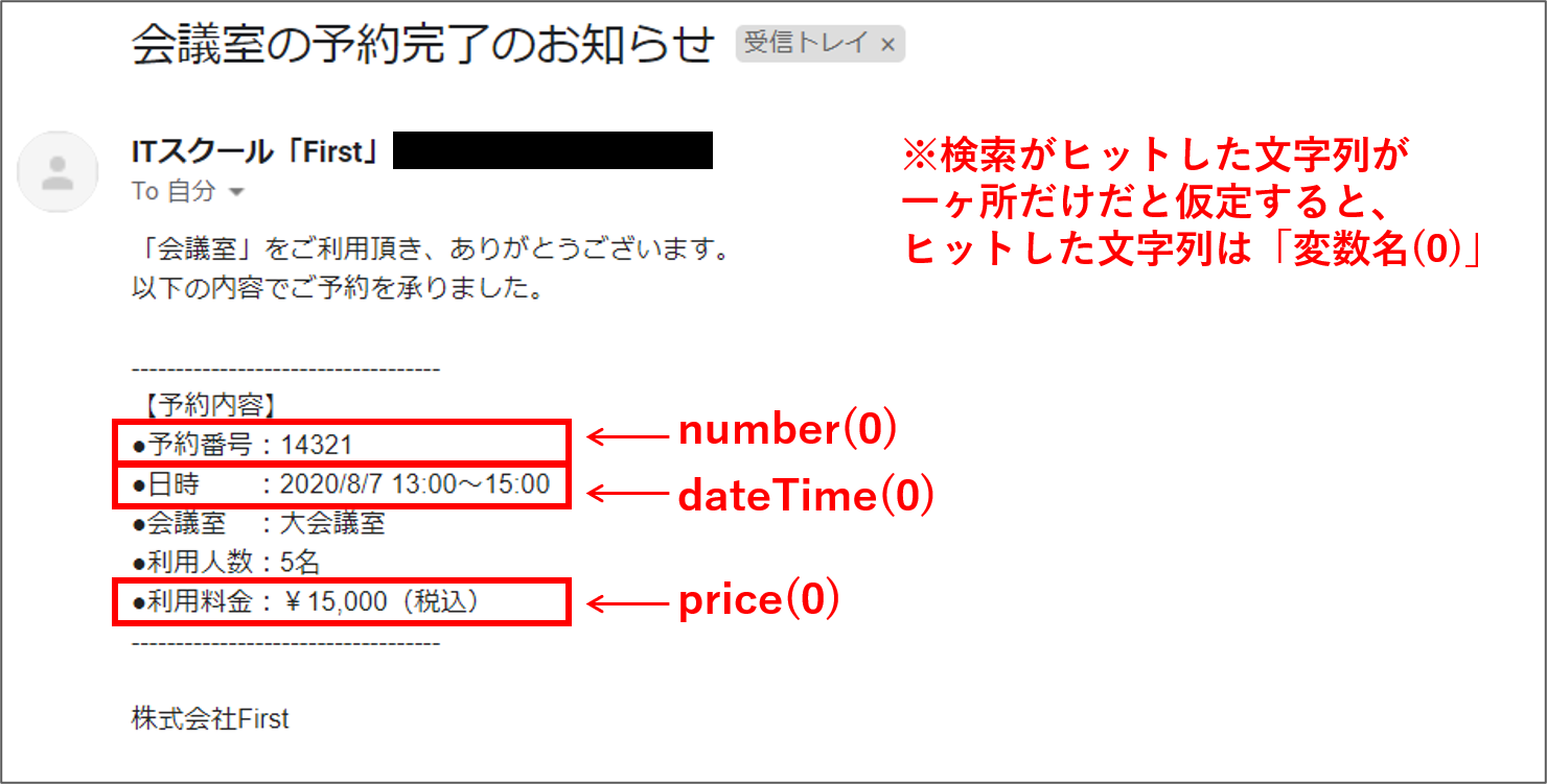 | Pattern | "\r\n●予約番号:(.*)\r\n" | 検索する文字列です。正規表現で記載します。 |