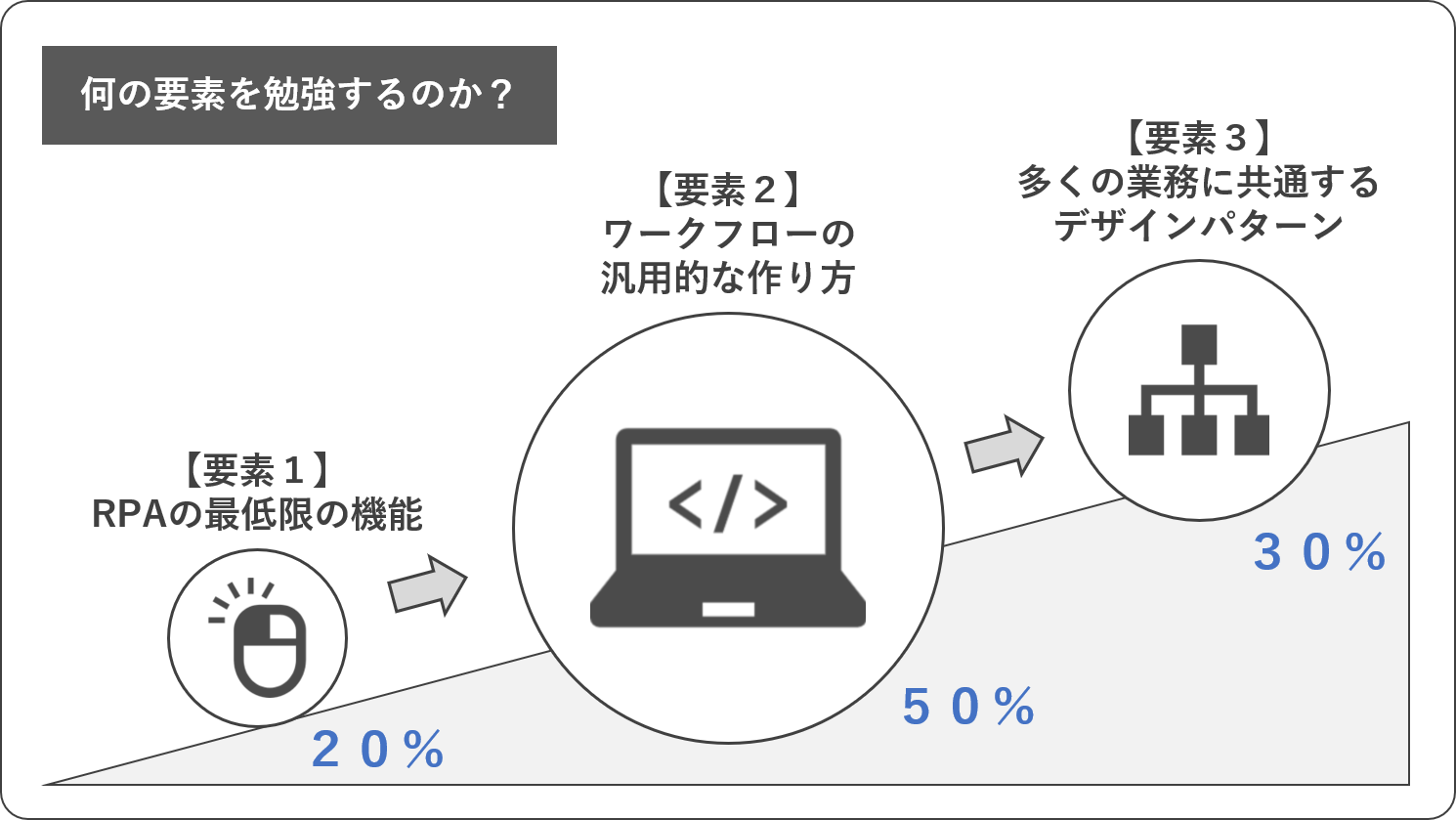 結論を述べると、RPAの効率的な勉強方法では、以下の要素をバランス良く勉強します。