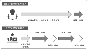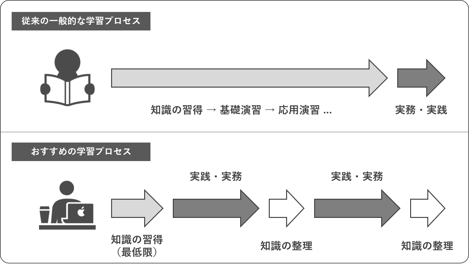 では、どのような学習プロセスで勉強すべきか。おすすめの学習プロセスでは、先ずは最低限の知識の習得を行います。その後、すぐに実務・実践に入ります。最初は全く歯が立たないので、こまめに知識の整理を行います。このサイクルを高速回転させます。知識の整理でフィードバックが入るので、知識の吸収率が高まり、上達が早くなります。
