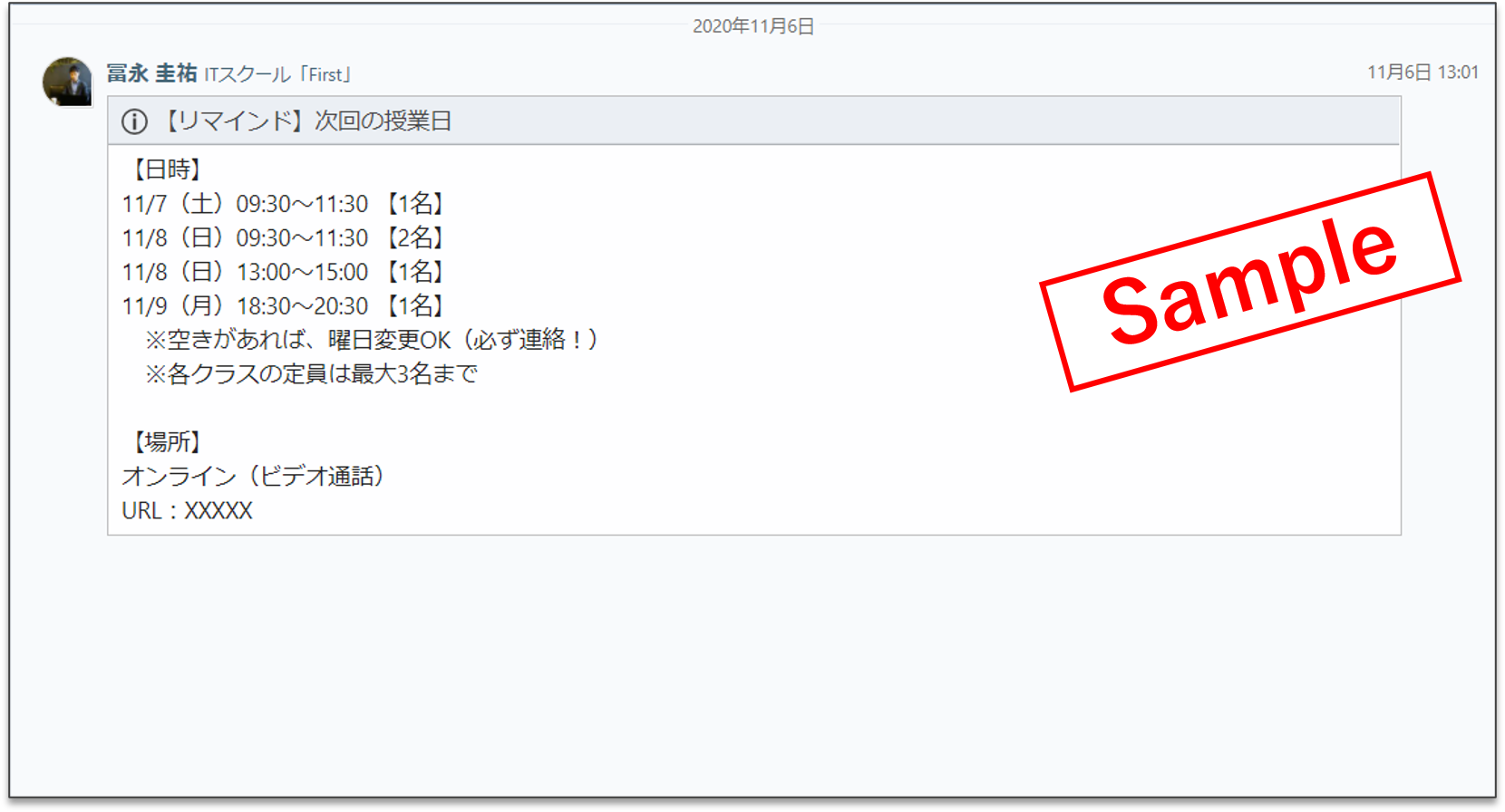 現在、当ITスクールでは、生徒とのコミュニケーションに「Chatwork」を使用しています。次回の授業日の案内(毎週1回)や、授業料支払いの案内(毎月1回)をChatworkのグループに手動で投稿しています。