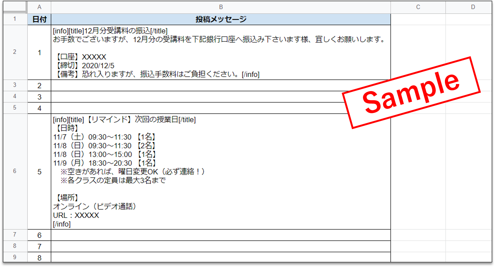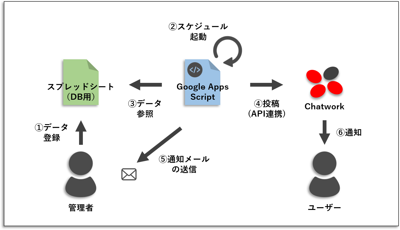 スクールでの各案内(リマインダー情報)を、GASのスクリプト処理でChatworkのグループに自動投稿するようにします。リマインダー情報は事前にスプレッドシートに登録するようにします。GASのトリガー機能(スケジュール起動)を使って、毎日決まった時間帯にスクリプトを実行して、リマインダー情報が登録されている場合のみ、Chatworkに投稿します。