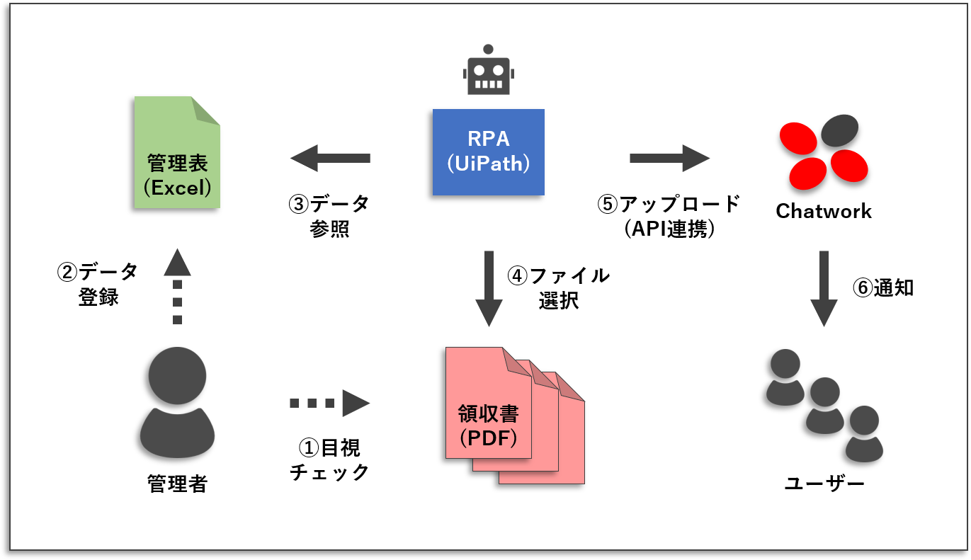 既に作成済みの領収書ファイル(PDF)を、RPAソフト(UiPath)とAPI連携を使って、Chatworkに自動アップロードします。各生徒の領収書に関するデータは事前に管理表ファイル(Excel)に登録するようにしました。管理者がRPAソフトの実行ボタンをクリックし、領収書ファイルが存在した場合のみ、Chatworkにアップロードするようにします。