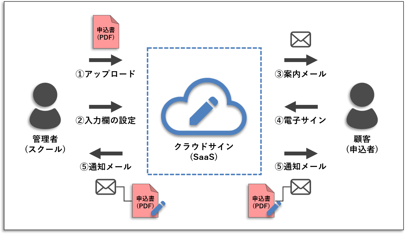 電子契約のクラウドサービス(SaaS)である「クラウドサイン」を導入して、スクールの申込手続きをオンライン化します。作成済みの申込書(PDFファイル)をクラウドサイン上にアップロードして、入力欄などの設定を行い申込者に送信します。