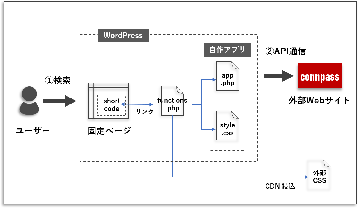 WordPressで作成したWebサイト上の固定ページに、PHP言語でコーディングしたWebアプリを公開(デプロイ)します。下記にシステムの全体像を示します。