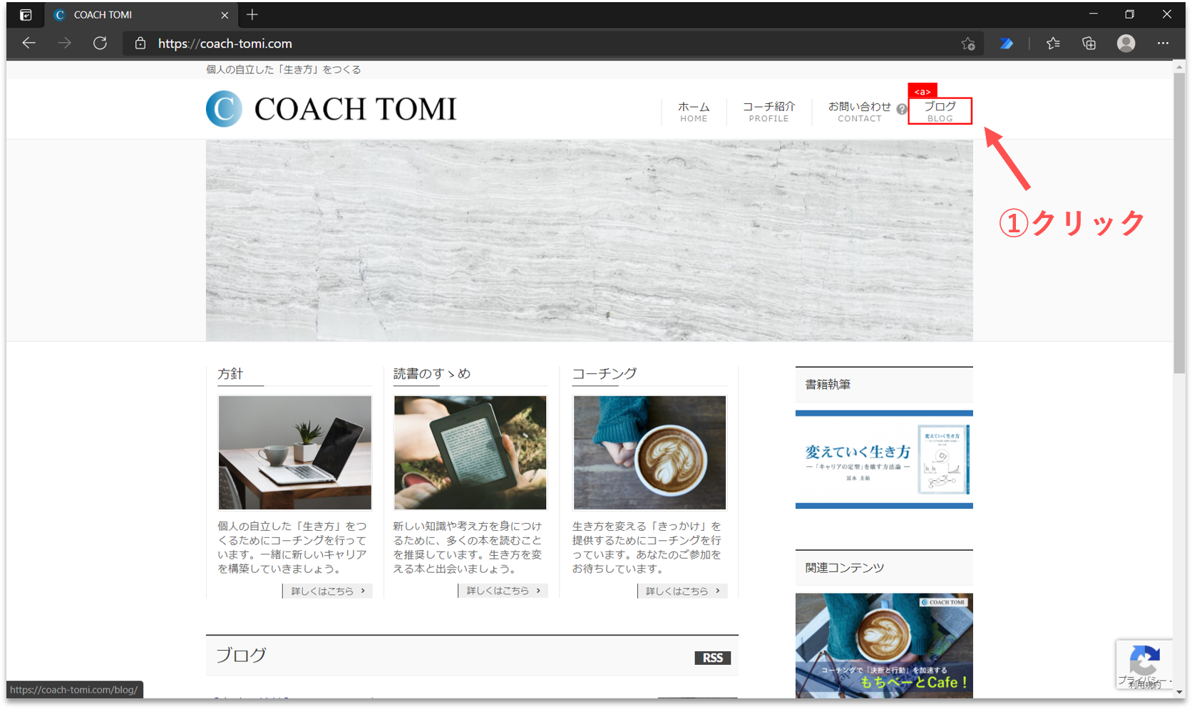 先ずは、ヘッダーメニューの「ブログ」にカーソルを合わせてクリックします。ブログ記事の一覧画面に遷移します。