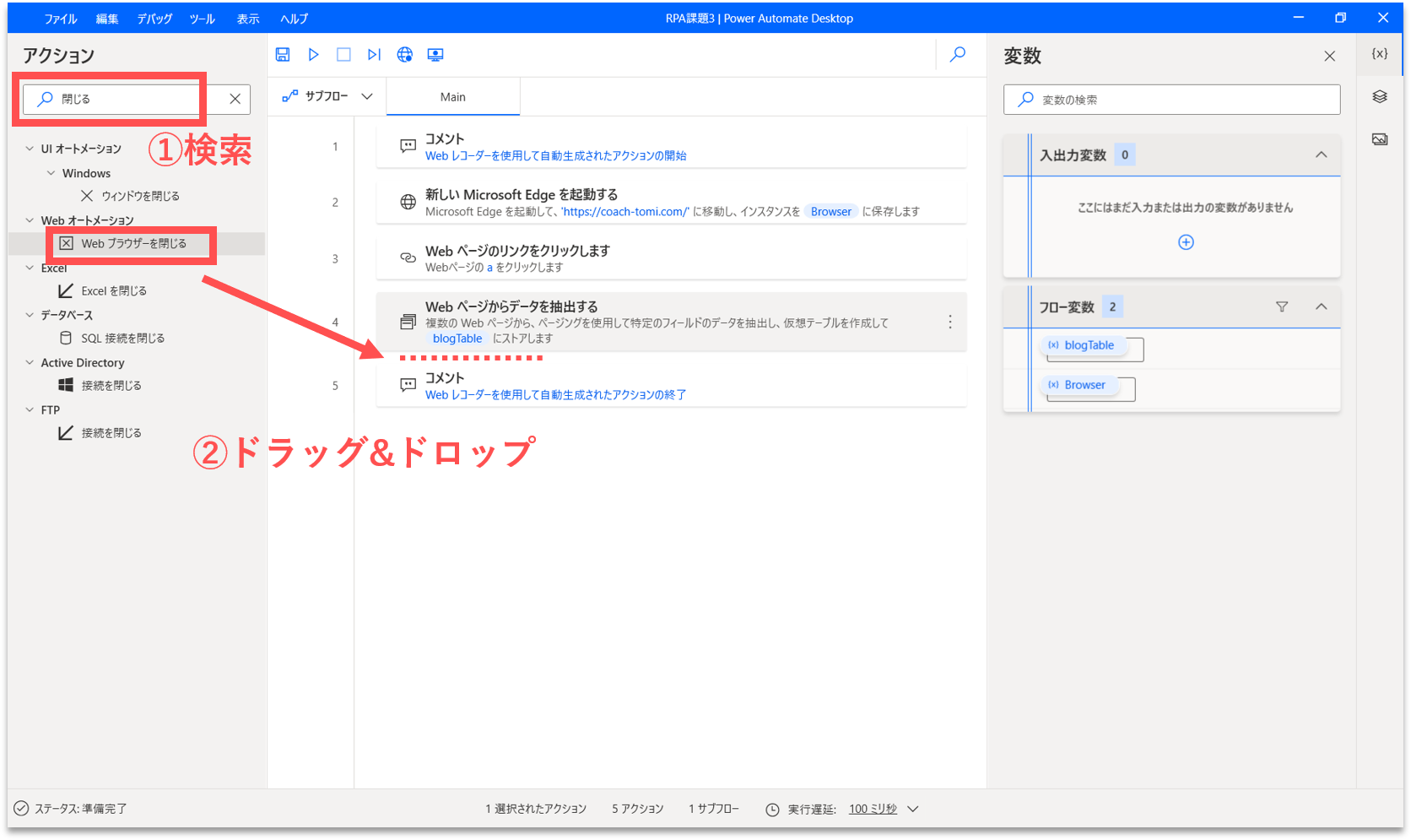 Webブラウザを閉じるために、アクションを追加したいと思います。画面左側のアクション検索窓に「閉じる」と入力します。「Webブラウザを閉じる」アクションを、フロー内の「Webページからデータを抽出する」アクションの直下にドラッグ&ドロップします。
