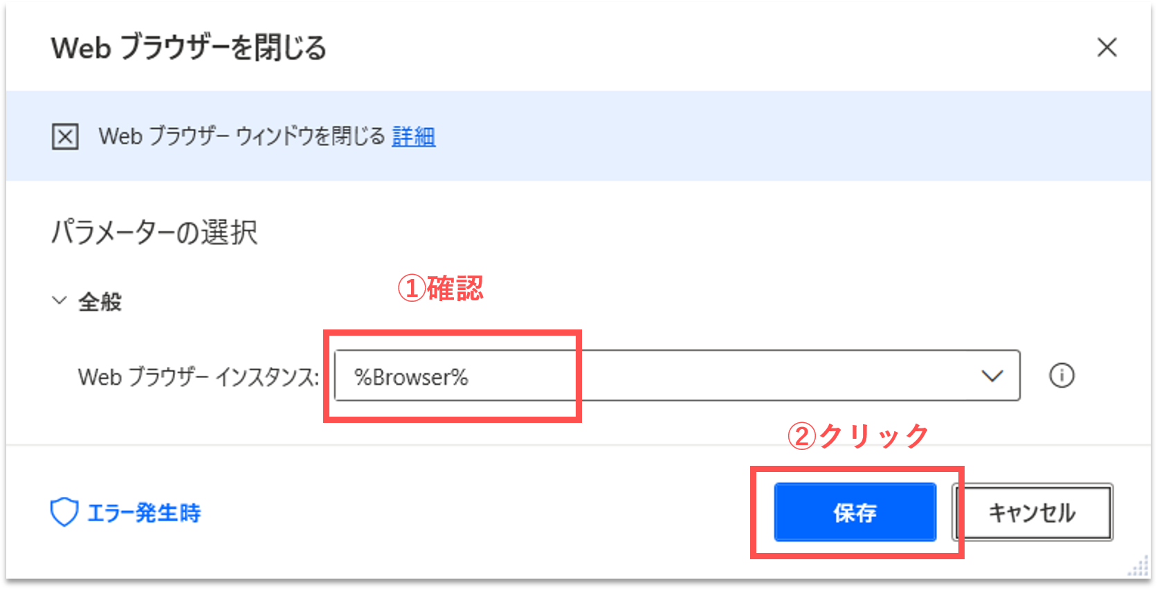 すると、プロパティ設定の画面が開きます。「Webブラウザインスタンス」に「%Browser%」が設定されていることを確認して、そのまま「保存」ボタンをクリックします。「%Browser%」は、最初に開いたWebブラウザのインスタンス名です。