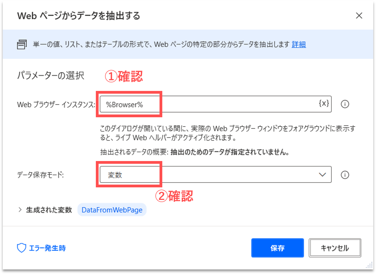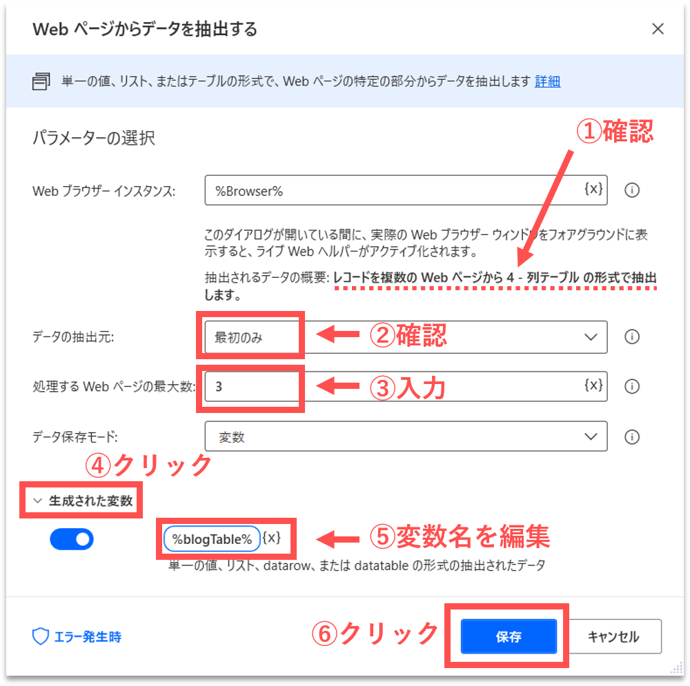 続けて、「生成された変数」をクリックして、変数名が「%DataFromWebPage%」になっていることを確認します。「生成された変数」には、取得した構造化データが格納されます。基本的に、変数名はその中身を推測できる名称をつけるべきです。今回は、「%blogTable%」に変更します。最後に、「保存」ボタンをクリックします。