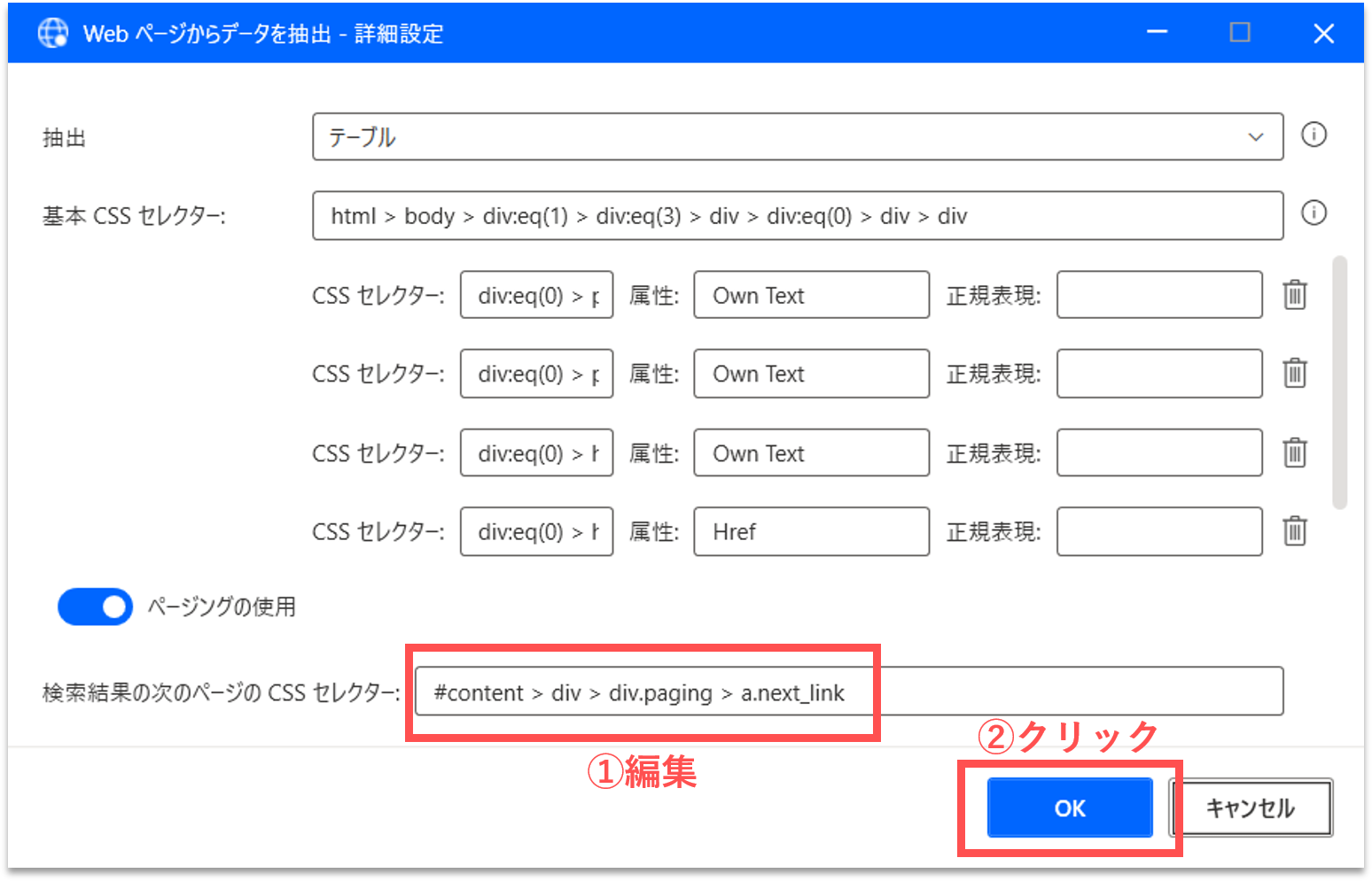 「詳細設定」パネルが表示され、各CSSセレクタの値が確認できます。CSSセレクタとは、Webサイト上の各要素の位置情報のようなものです。CSSセレクタが極端に長いと、Webサイトの構造が少し変化するだけで、要素を正しく指定することができなくなります。今回は、「検索結果の次のページのCSSセレクタ」の値が若干長いため、下記の値に変更しておきます。詳細は割愛しますが、CSSセレクタは、各種ブラウザの開発者ツールなどで取得できます。編集後に「OK」ボタンをクリックします。