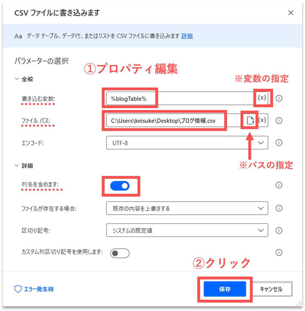 | 1 | 書き込む変数 | %blogTable% ※{x}アイコンをクリックして、作成済みの変数を選択することもできます。 |